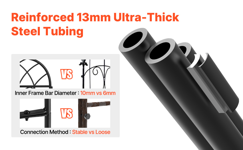 Vyberte si kovovú záhradnú mriežku navrhnutú pre pokoj. Vďaka mimoriadne hrubým 13 mm oceľovým rúrkam poskytuje pevnú oporu pre vaše rastliny, vďaka čomu si môžete bez obáv užívať radosť zo sledovania rozkvetu vašej zelene!