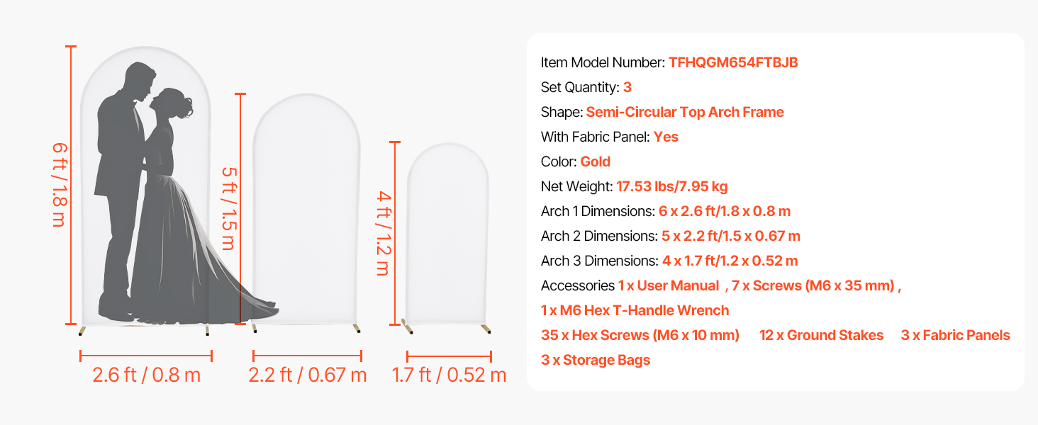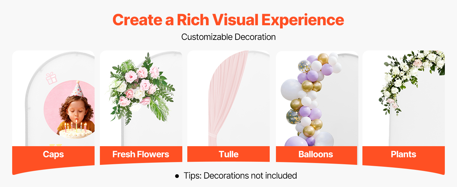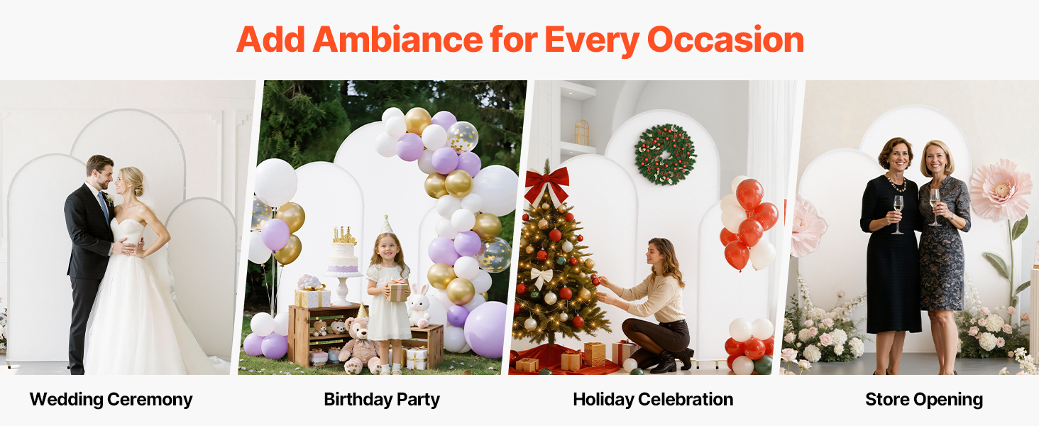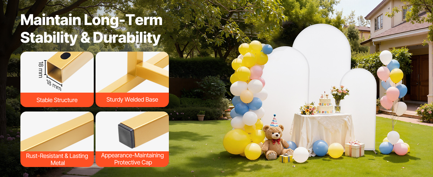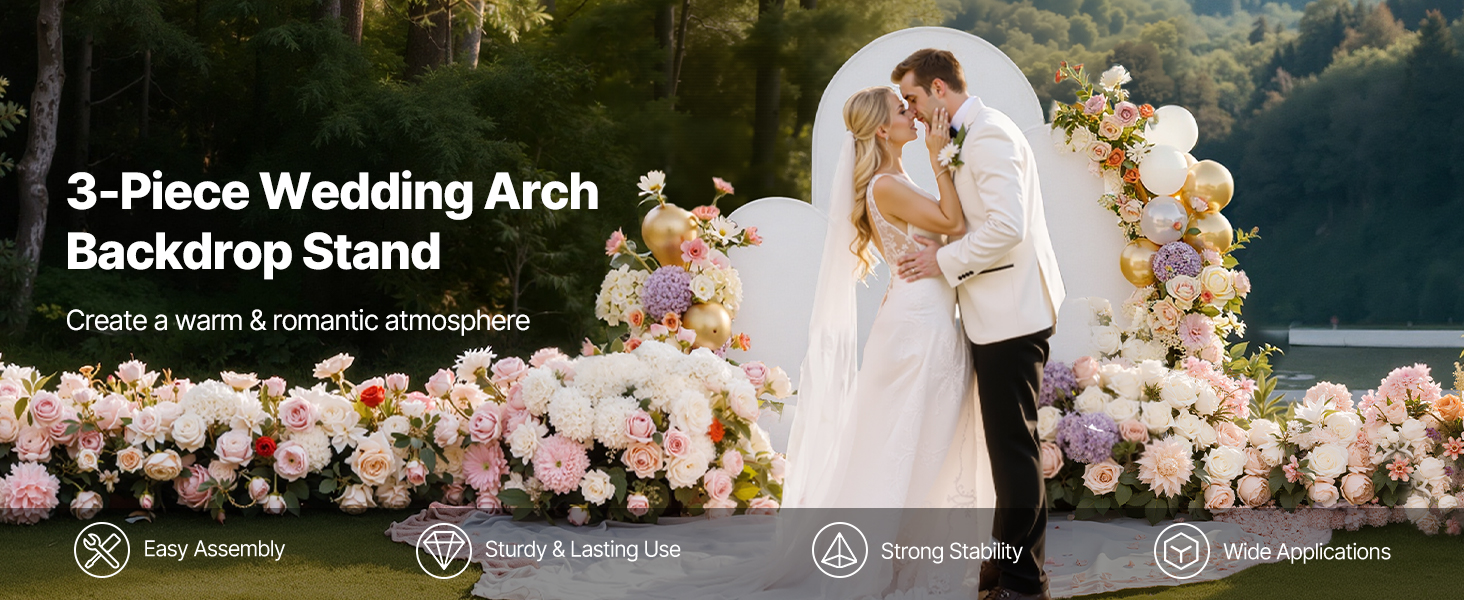 Tento 3-dielny stojan s oblúkovým pozadím sa ľahko montuje. Vďaka kovovému rámu zaručuje stabilitu a dlhú životnosť. Je ideálny pre vnútorné aj vonkajšie príležitosti a pomáha bez námahy vytvoriť teplú a romantickú atmosféru.