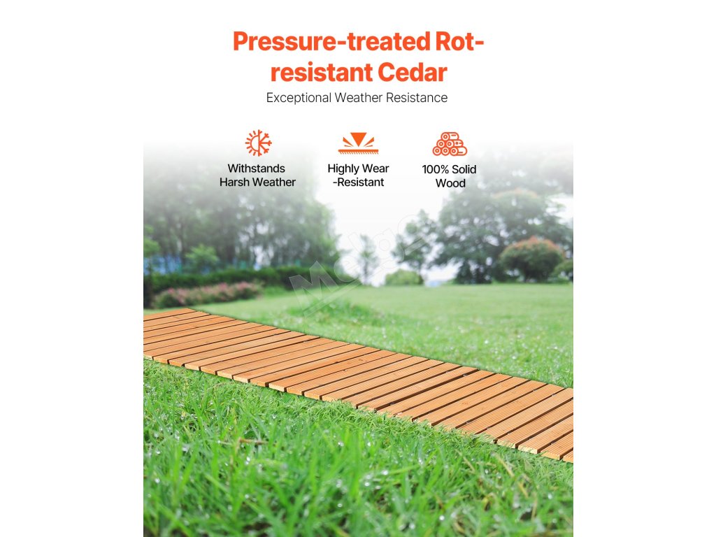 Tento drevený záhradný chodník je krásny a praktický, zabraňuje vzniku blata a zároveň poskytuje stabilitu. Je vyrobený z tlakovo ošetreného cédra a má protišmykovú konštrukciu na zaistenie bezpečnosti. Je ideálny pre záhrady, terasy a zhromaždenia, ľahko sa skladuje a je ideálny pre rôzne vonkajšie prostredie.