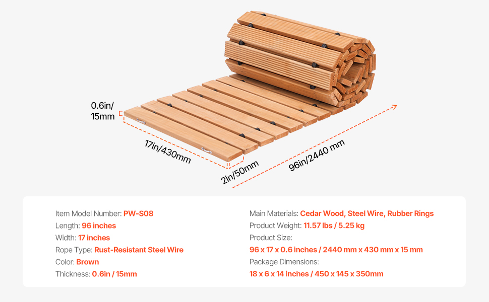 Drevená záhradná rohož 8 ft × 17 in, cédrová, protišmyková navíjacia
