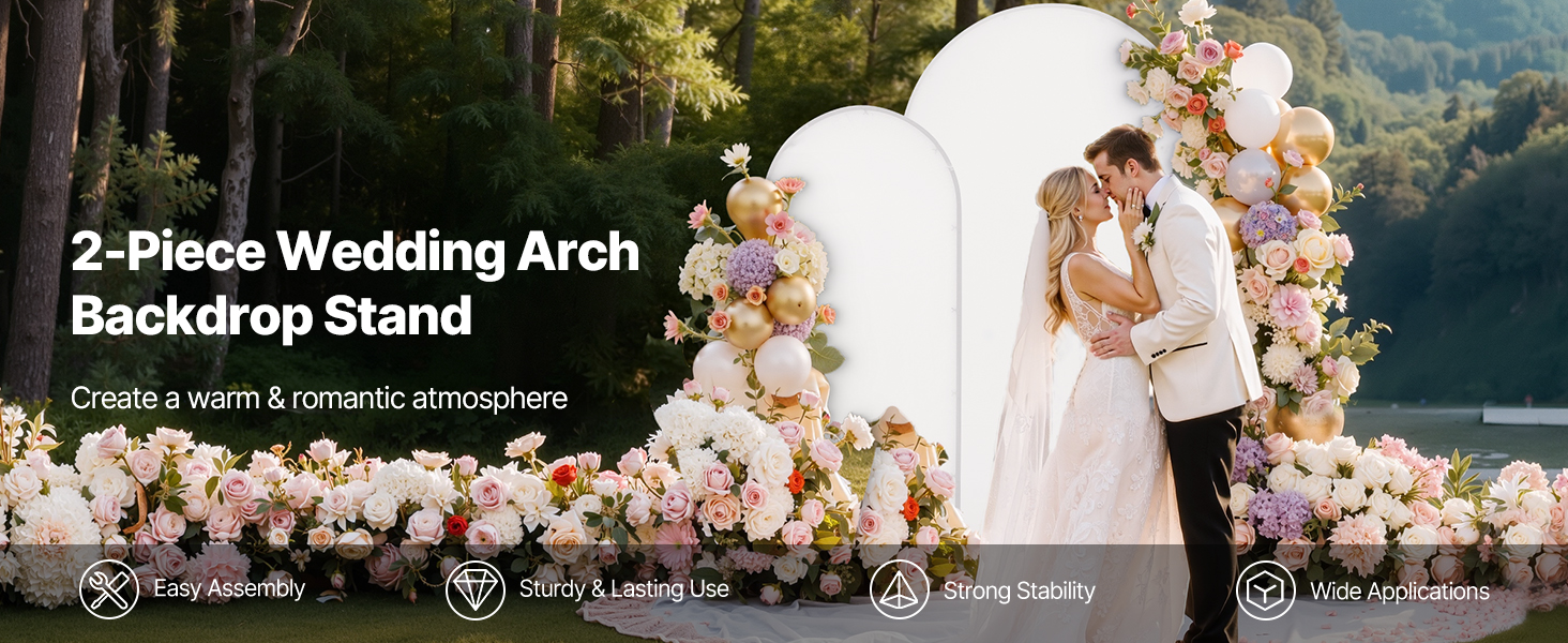 Tento stojan na pozadie s 2 súpravami oblúkov sa ľahko zostavuje. Vďaka kovovému rámu zaručuje stabilitu a dlhodobé používanie. Je ideálny na vnútorné aj vonkajšie príležitosti a pomáha bez námahy vytvoriť hrejivú a romantickú atmosféru.
