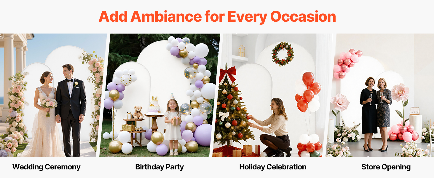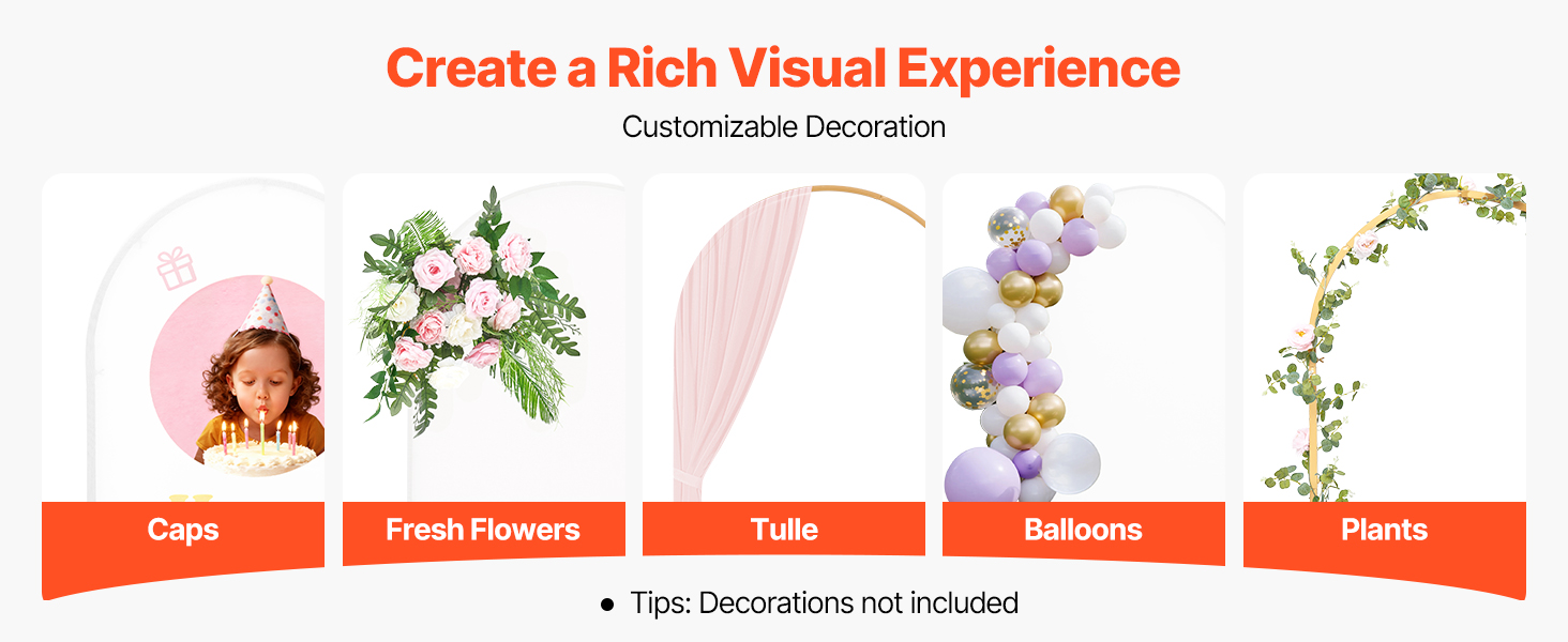 Tento kovový oblúkový stojan, ktorý je ideálny na svadby, večierky, festivaly alebo otvorenia obchodov, dodá vizuálnu príťažlivosť a atmosféru každej príležitosti, vďaka čomu bude vaša udalosť elegantnejšia a pútavejšia.