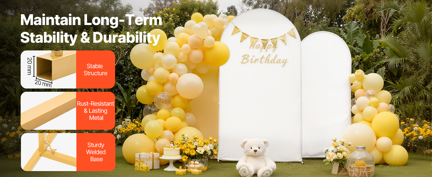 Náš oblúkový stojan umožňuje flexibilné zdobenie balónmi, tylom alebo inými dekoráciami. Dokáže vytvoriť jedinečné pozadie, ktoré bude zodpovedať vášmu štýlu.