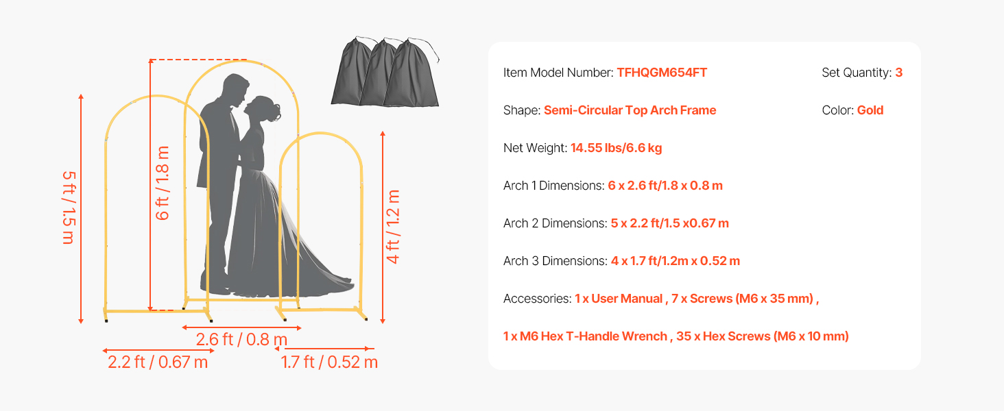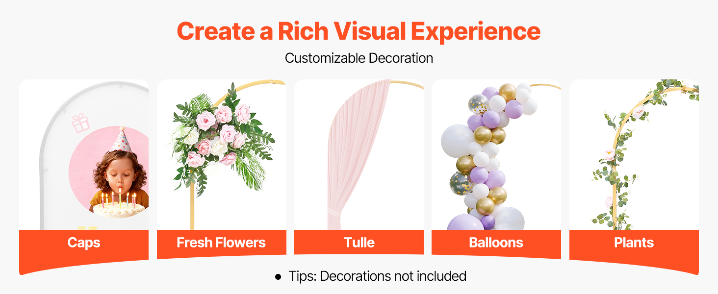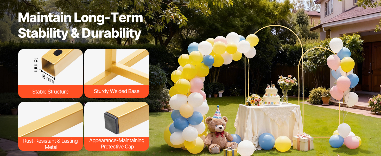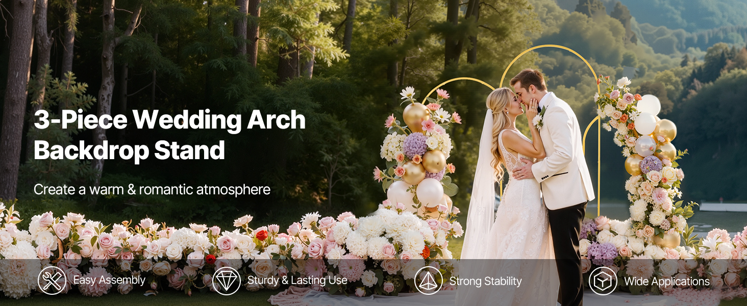 Tento 3-dielny stojan s oblúkovým pozadím sa ľahko montuje. Vďaka kovovému rámu zaručuje stabilitu a dlhú životnosť. Je ideálny pre vnútorné aj vonkajšie príležitosti a pomáha bez námahy vytvoriť teplú a romantickú atmosféru.