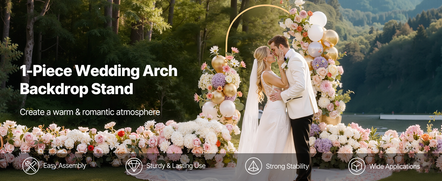 Tento 1-setový oblúkový stojan na pozadie sa ľahko zostavuje. Vďaka kovovému rámu zaručuje stabilitu a dlhodobé používanie. Je ideálny na vnútorné aj vonkajšie príležitosti a pomáha bez námahy vytvoriť hrejivú a romantickú atmosféru.