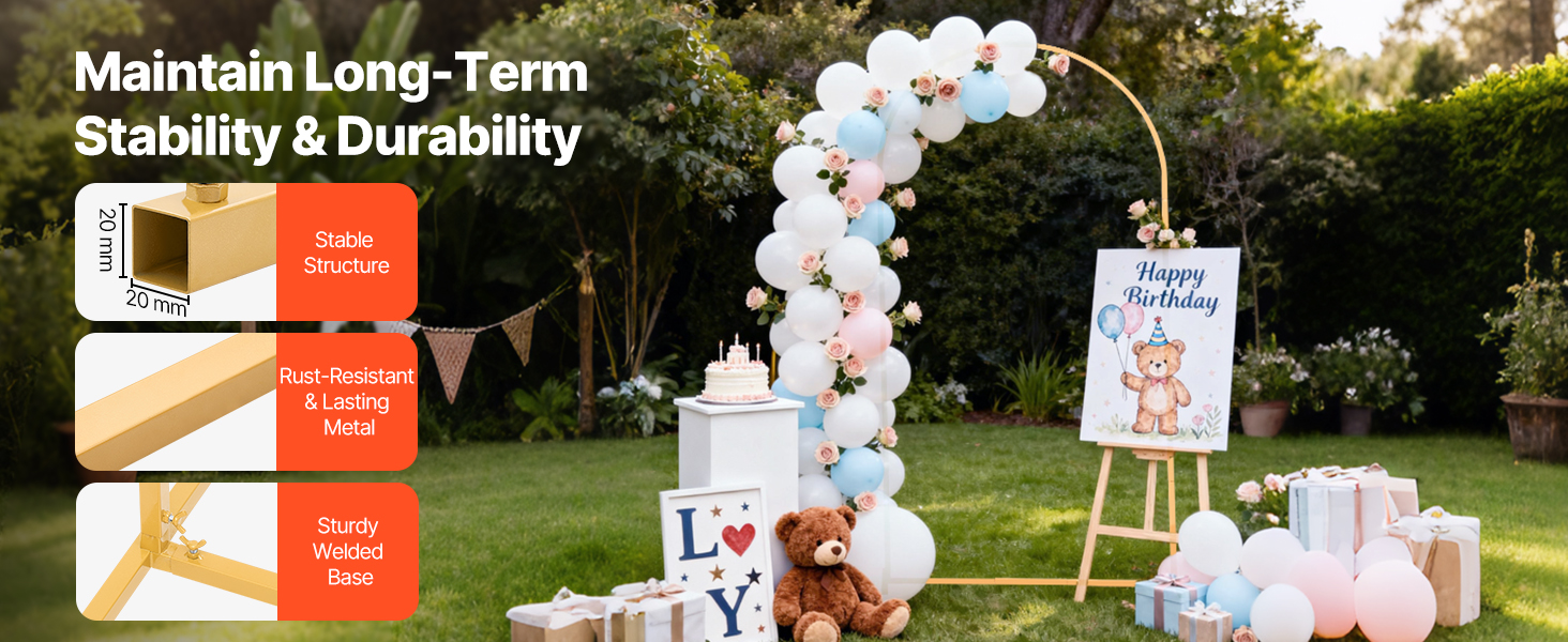 Náš oblúkový stojan umožňuje flexibilné zdobenie balónmi, tylom alebo inými dekoráciami. Dokáže vytvoriť jedinečné pozadie, ktoré bude zodpovedať vášmu štýlu.