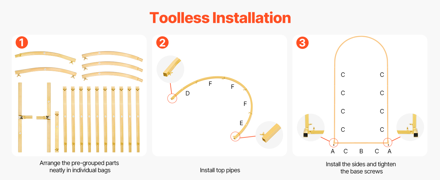 Toto zlaté oblúkové pozadie možno nainštalovať bez použitia náradia. Jeho súčasti sú jednotlivo zabalené a zoskupené, aby sa znížila náročnosť montáže a pomohli vám ľahko dokončiť montáž.