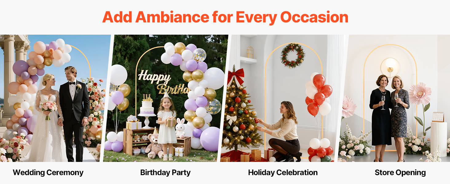 Tento kovový oblúkový stojan, ktorý je ideálny na svadby, večierky, festivaly alebo otvorenia obchodov, dodá vizuálnu príťažlivosť a atmosféru každej príležitosti, vďaka čomu bude vaša udalosť elegantnejšia a pútavejšia.