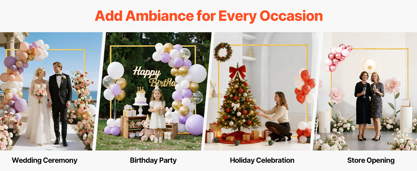 Tento kovový oblúkový stojan, ktorý je ideálny na svadby, večierky, festivaly alebo otvorenia obchodov, dodá každej príležitosti vizuálnu príťažlivosť a atmosféru, vďaka čomu bude vaša udalosť elegantnejšia a pútavejšia.