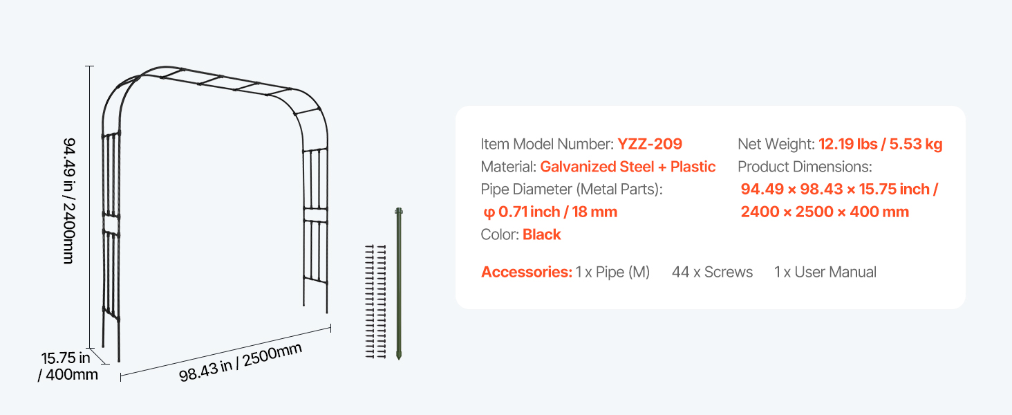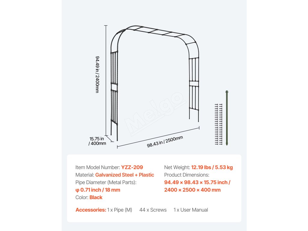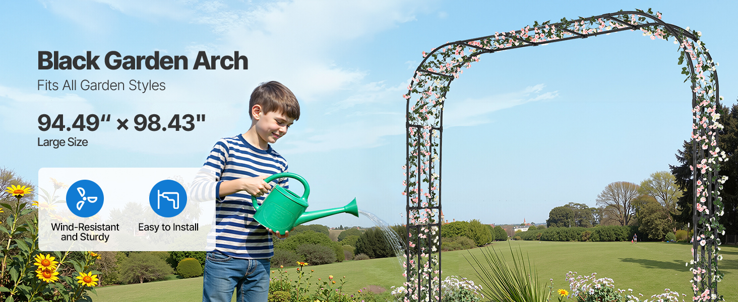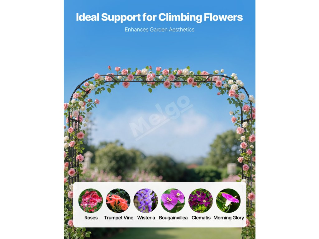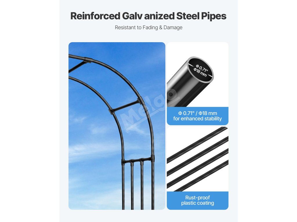 Tento záhradný oblúk zvýrazňuje estetiku vašej záhrady a hodí sa k rôznym štýlom záhradníctva. Je vyrobený z pozinkovaných oceľových rúrok, vystužený T-spojkami pre odolnosť voči vetru. S rozmermi 94,49 x 98,43 palca je priestranný a ideálny pre popínavé rastliny, ako aj na svadobné, sviatočné a eventové dekorácie.