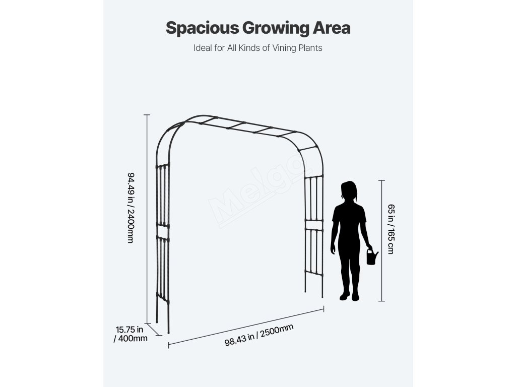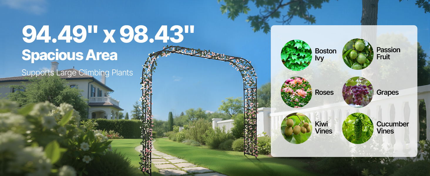 S rozmermi 94,49 x 98,43 palca je tento oblúk vhodný pre veľké popínavé rastliny, ako je brečtan, hrozno a maracuja, čím zlepšuje efektívnosť popínania rastlín a vytvára vertikálnu zelenú záhradu.