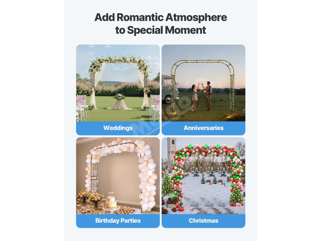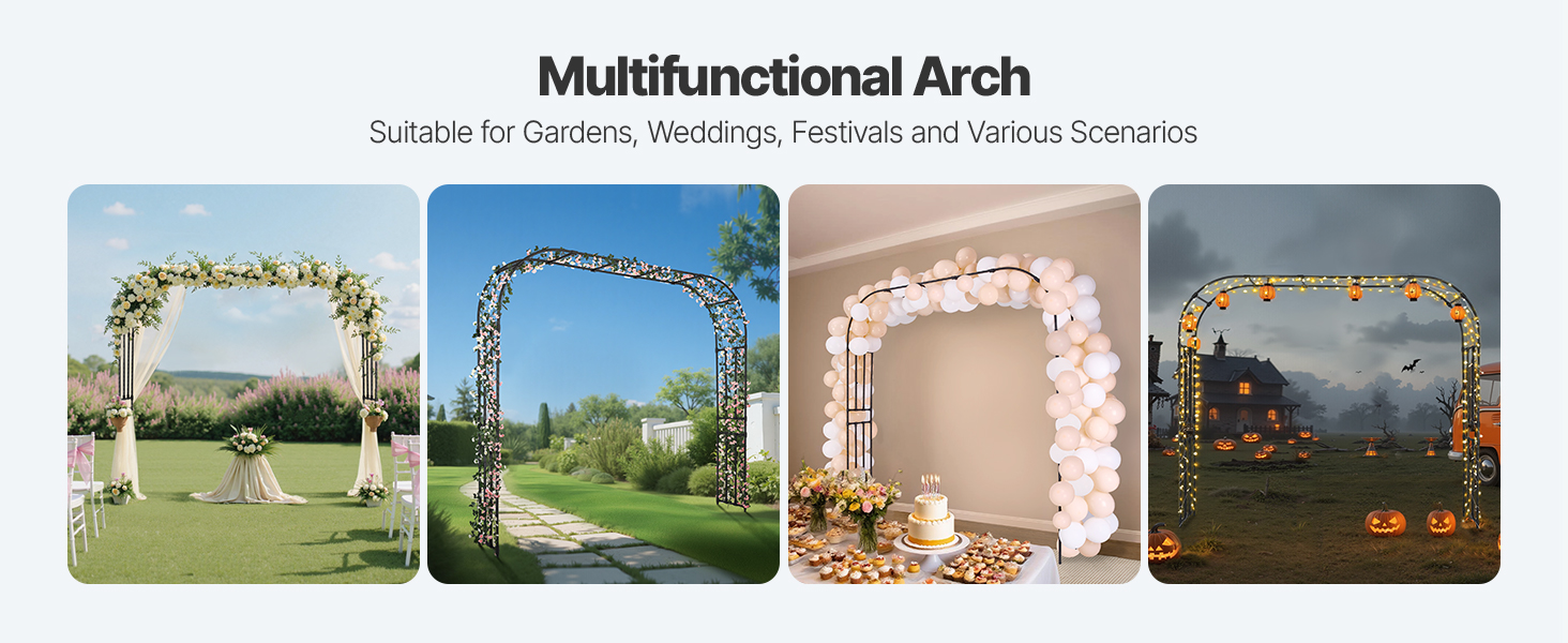 Náš svadobný oblúk slúži nielen ako opora pre rastliny, ale je vhodný aj na zavesenie kvetov, balónov, svetiel a ďalších dekorácií. Je ideálny na svadby, oslavy alebo slávnosti, kde vytvára romantickú atmosféru a trvalé spomienky. Je to funkčný a zároveň krásny dekoratívny oblúk.