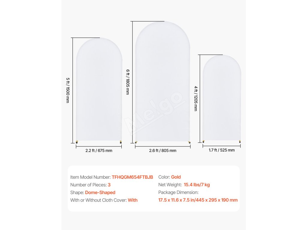 Tento 3-dielny zlatý svadobný oblúkový stojan na pozadie s rozmermi 6 x 2,6 ft, 5 x 2,2 a 4 x 1,7 ft s gázou dodáva svadbám romantiku a eleganciu. Stane sa pre hostí ohniskom hodným fotografovania. Modernizovaný odolný kovový rám s rozmermi 18 x 18 mm zaisťuje stabilitu a odolnosť.