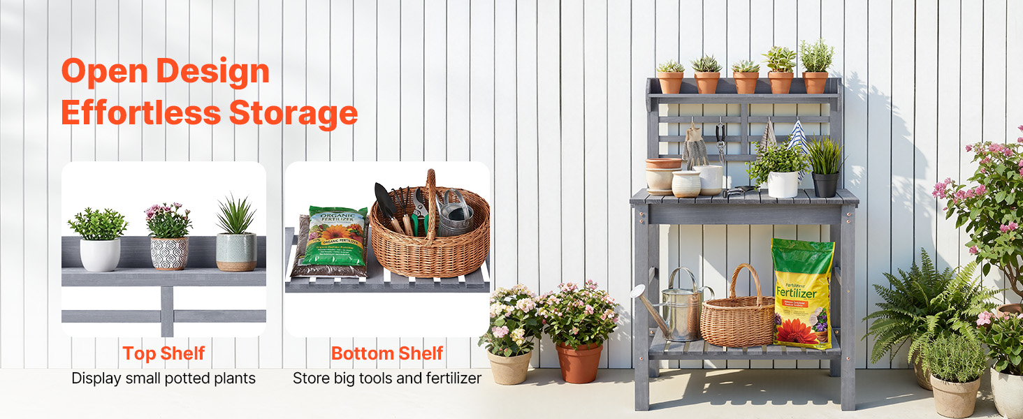 Tento vonkajší stolík na sadenie má hornú policu na malé rastliny v kvetináčoch, zatiaľ čo skrinka a spodná polica slúžia na uloženie väčších nástrojov, hnojív a ďalších vecí. Štyri háčiky udržujú uteráky a rukavice pekne na dosah.