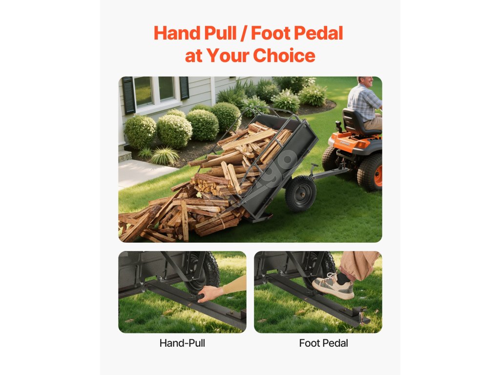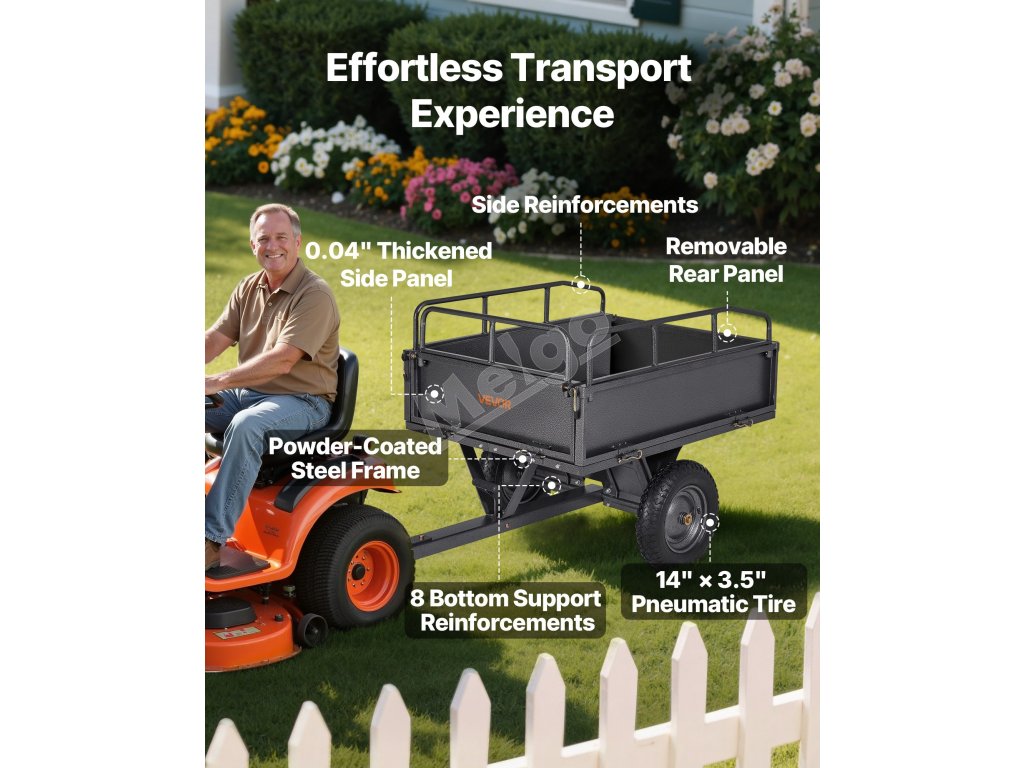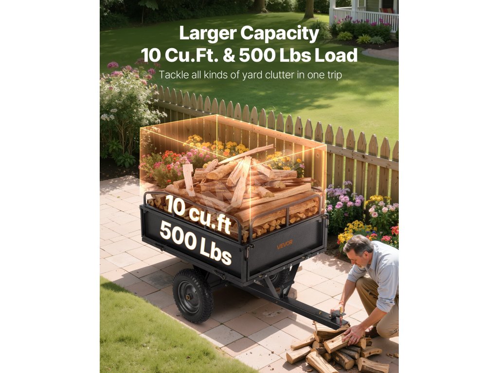 Tento ťažký záhradný príves dokáže odviezť až 500 lbs, čím ľahko prepraví ťažké predmety, ako je drevo, tehly a stavebný materiál. Je to ideálny nástroj na záhradnícke práce, ktorý zvyšuje efektivitu a uľahčuje prácu.