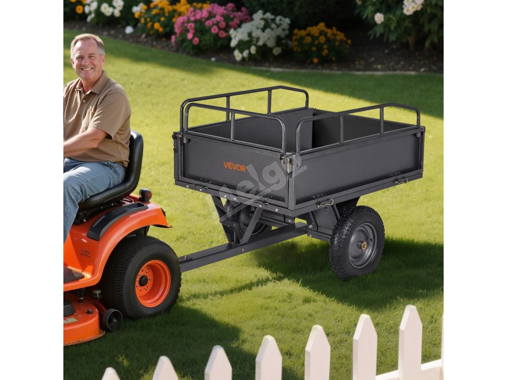 Tento 500lb záhradný príves je vhodný pre rôzne vozidlá vrátane traktorov, štvorkoliek a kosačiek na trávu. Vďaka oceľovému rámu, zosilneným podporným tyčiam a pneumatikám ponúka nosnosť 500 lbs a 10 kubických stôp priestoru. Pneumatiky s priemerom 14 palcov zabezpečujú plynulý pohyb po tráve a blate, čo umožňuje efektívnu prácu v záhrade.