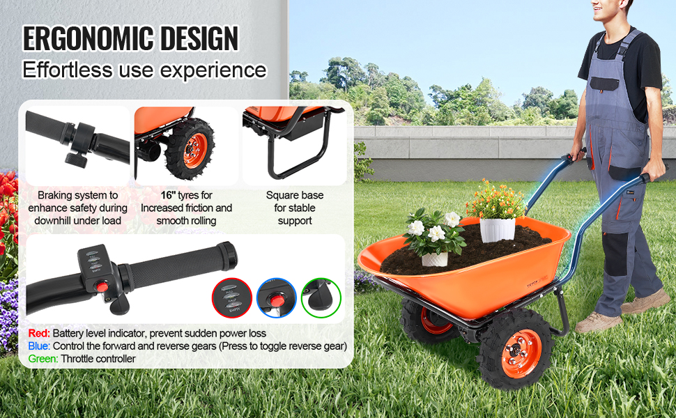 Tento elektrický záhradný vozík s 500W motorom a veľkokapacitnou batériou znižuje manuálnu námahu a umožňuje dlhšie používanie. Šestnásťpalcové koleso s hlbokými behúňmi zabezpečuje plynulý a bezpečný pohyb. Vďaka kovovému rámu, gumovým pneumatikám a priestrannému zásobníku je ideálny na prepravu rastlín, zeminy atď.