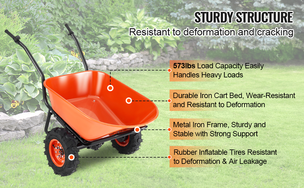 Zostavený s pevným železným rámom a vaničkou spolu s gumovými pneumatikami odolnými proti opotrebovaniu zaručuje elektrický záhradný vyklápací vozík dlhodobú trvanlivosť a odolnosť voči deformácii alebo praskaniu, vďaka čomu je spoľahlivý na vonkajšie použitie.
