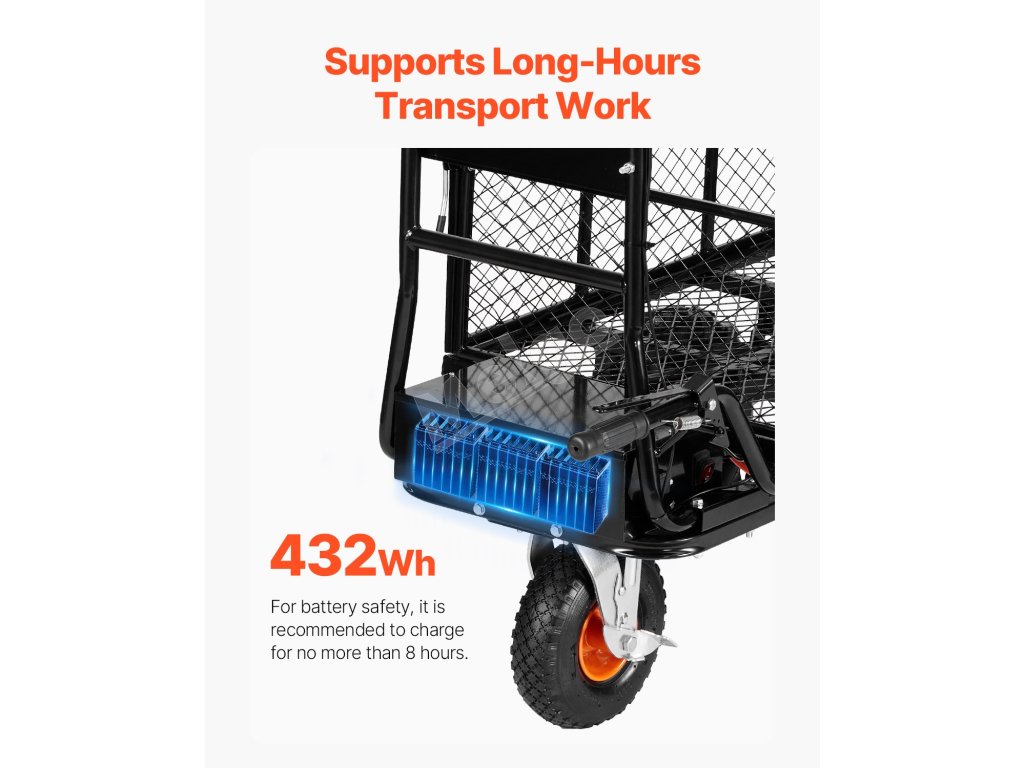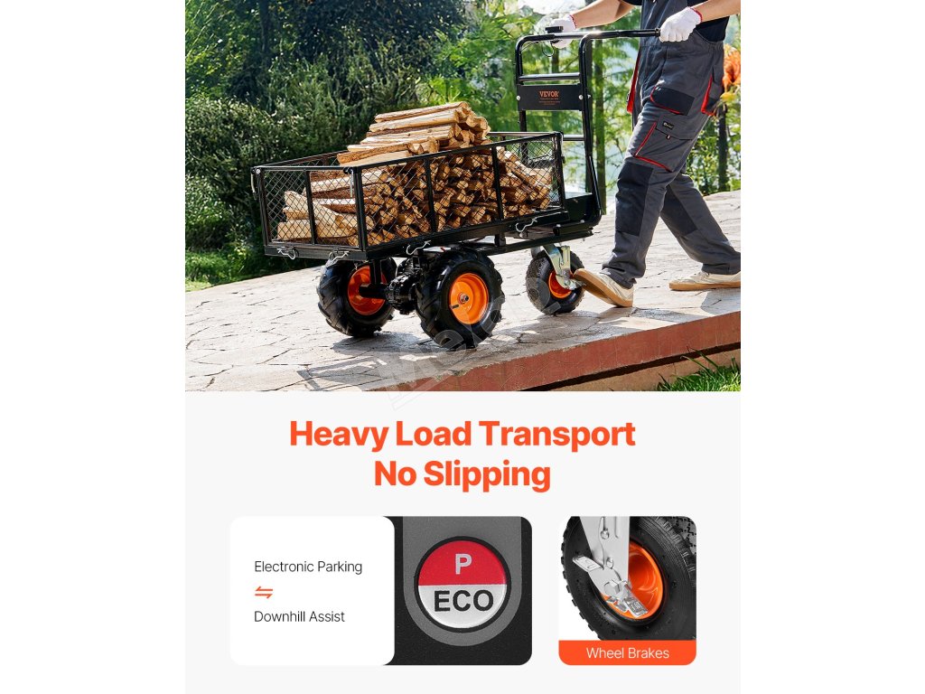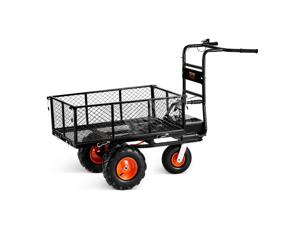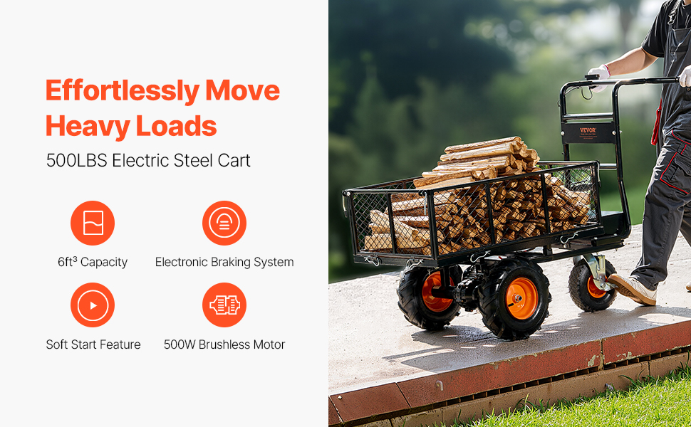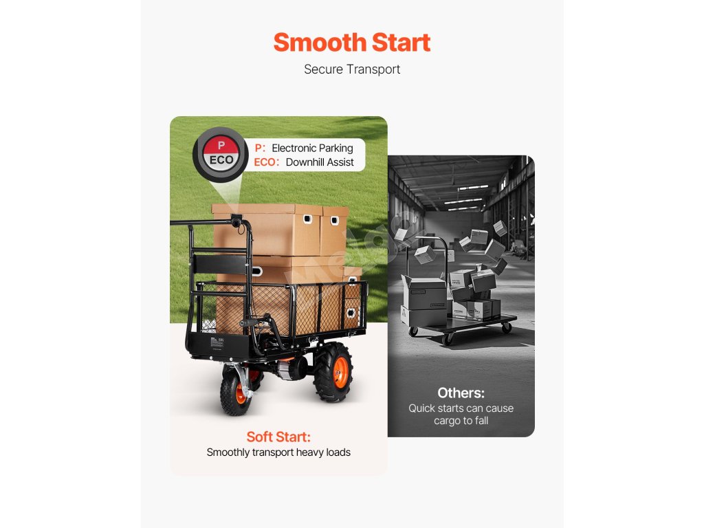 Tento elektrický oceľový vozík má 500W bezkartáčový motor, kapacitu 6 stôp³ a nosnosť 500 libier. Vďaka elektronickému parkovaciemu systému, asistentovi pre zjazd z kopca a brzdám kolies zabezpečuje stabilitu. Ľahko prepína medzi režimami ohrady a plošiny. Vďaka 13-palcovým gumovým kolesám a 90° vykladaniu je preprava bez námahy.