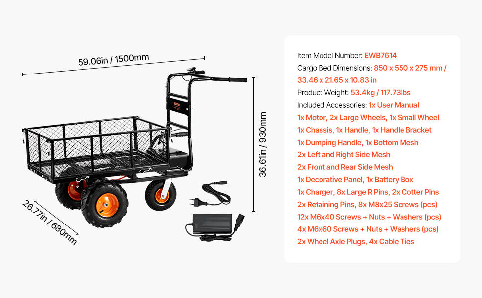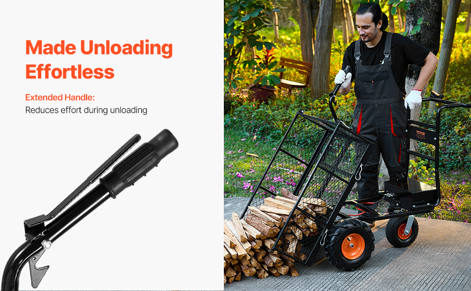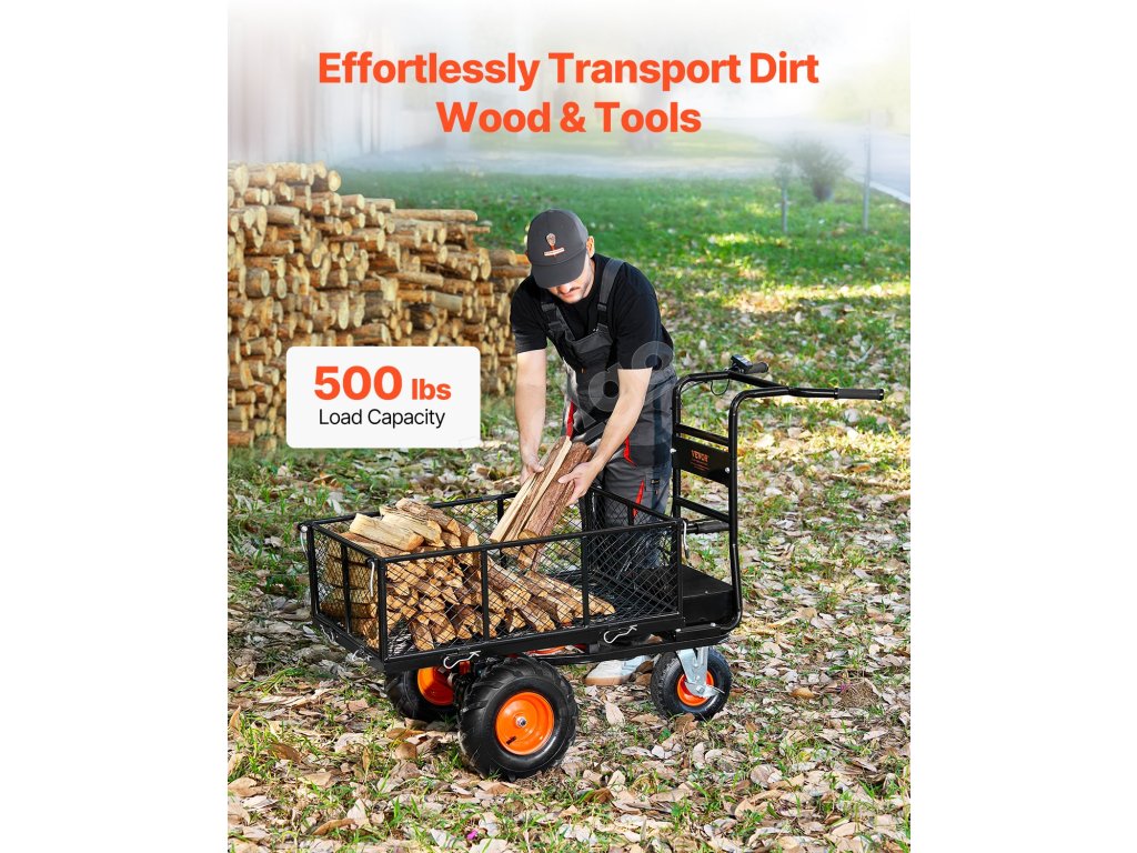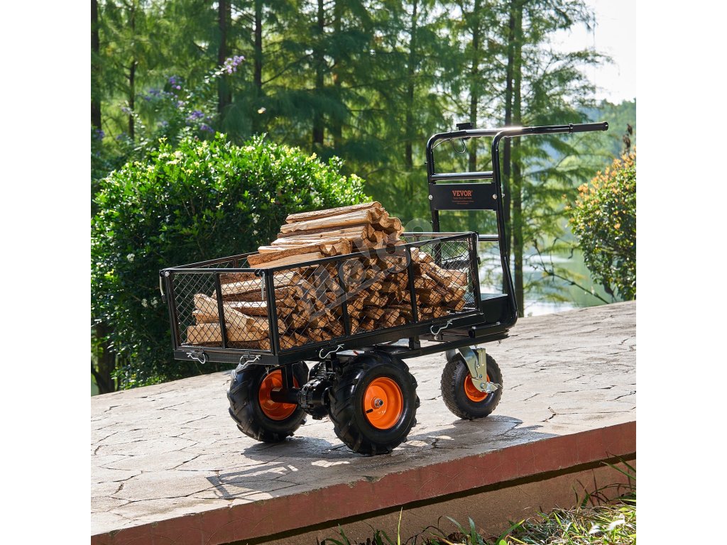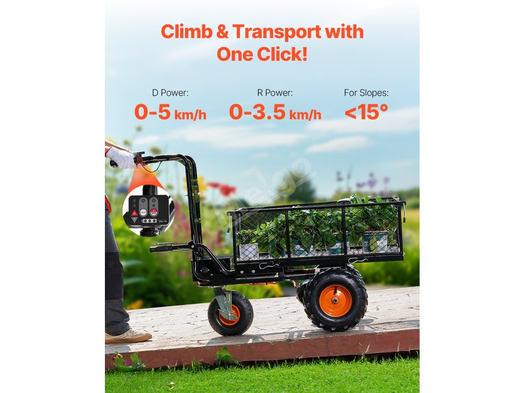Tento elektrický oceľový vozík má 500W bezkartáčový motor, kapacitu 6 stôp³ a nosnosť 500 libier. Vďaka elektronickému parkovaciemu systému, asistentovi pre zjazd z kopca a brzdám kolies zabezpečuje stabilitu. Ľahko prepína medzi režimami ohrady a plošiny. Vďaka 13-palcovým gumovým kolesám a 90° vykladaniu je preprava bez námahy.