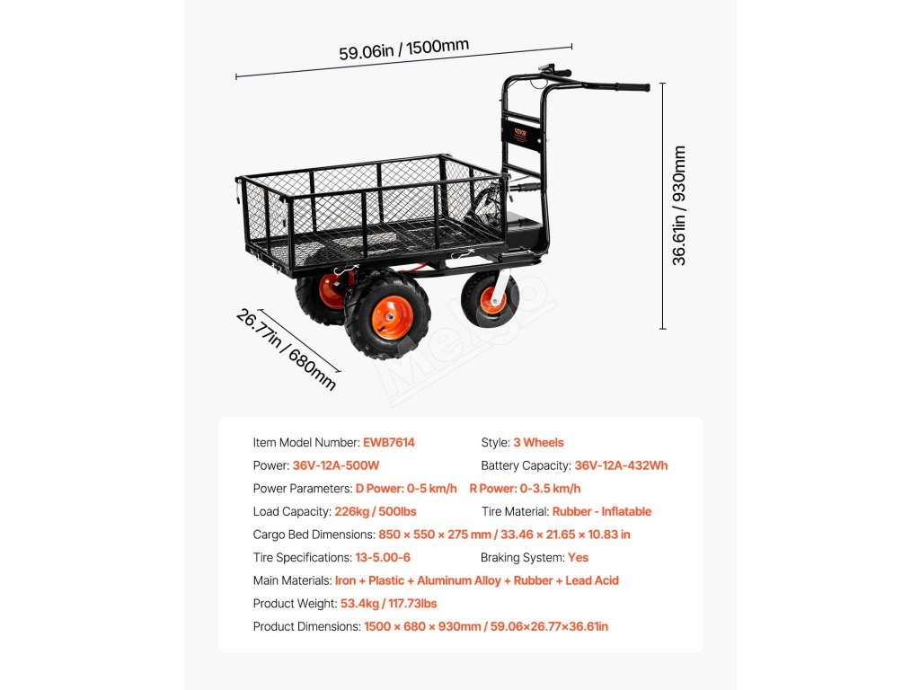 Elektrický vozík 500lbs 36V 432W, oceľový s brzdou pre farmu a záhradu