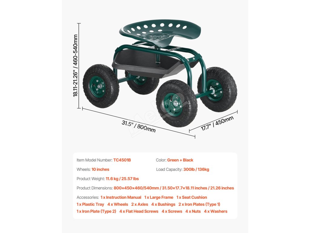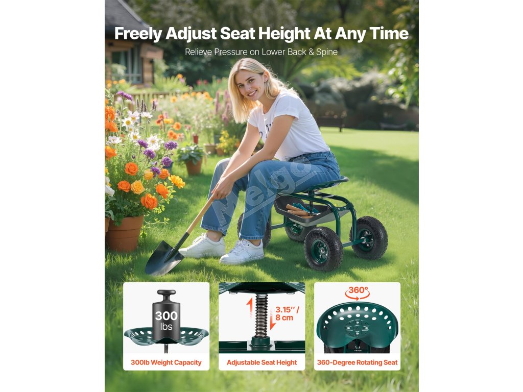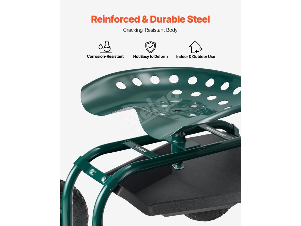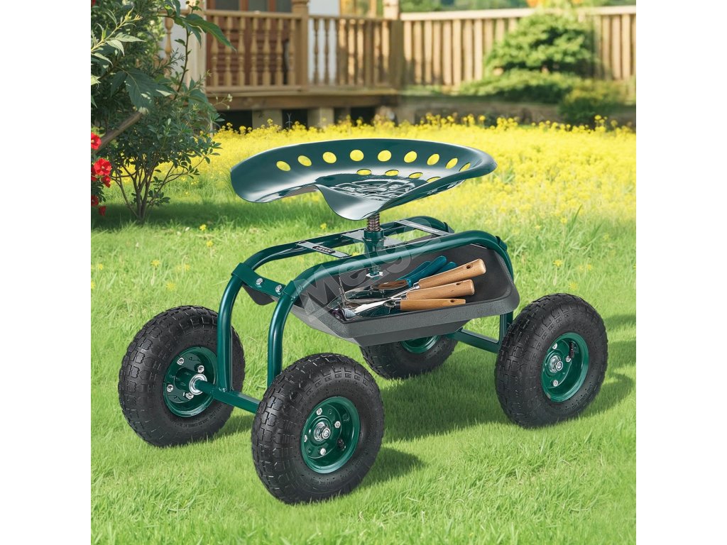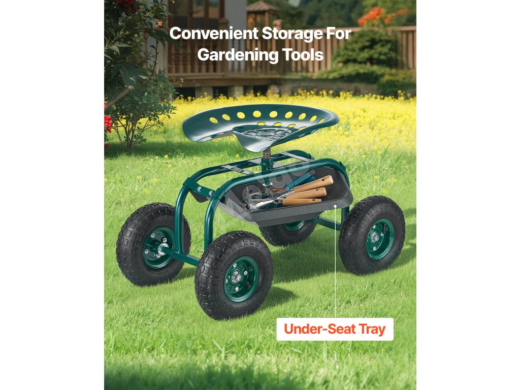 Pojazdný záhradný vozík so otočným sedadlom a košíkom, nosnosť 300 lbs