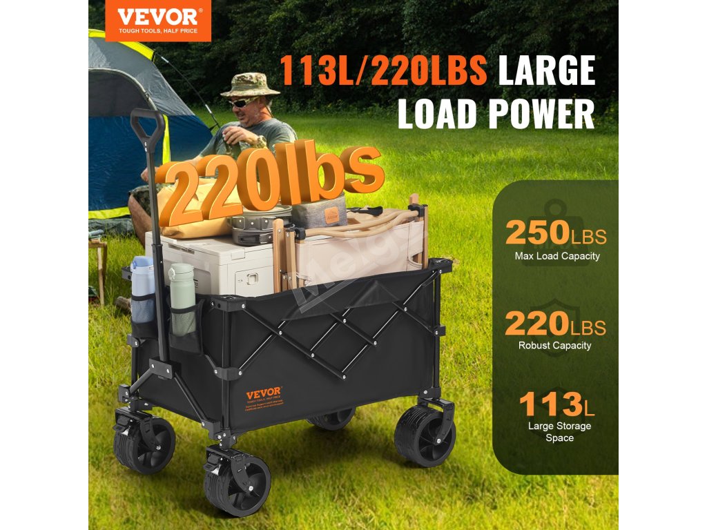 Skladací vozík 113 L, nosnosť 250 lbs, terénne kolesá, držiaky nápojov