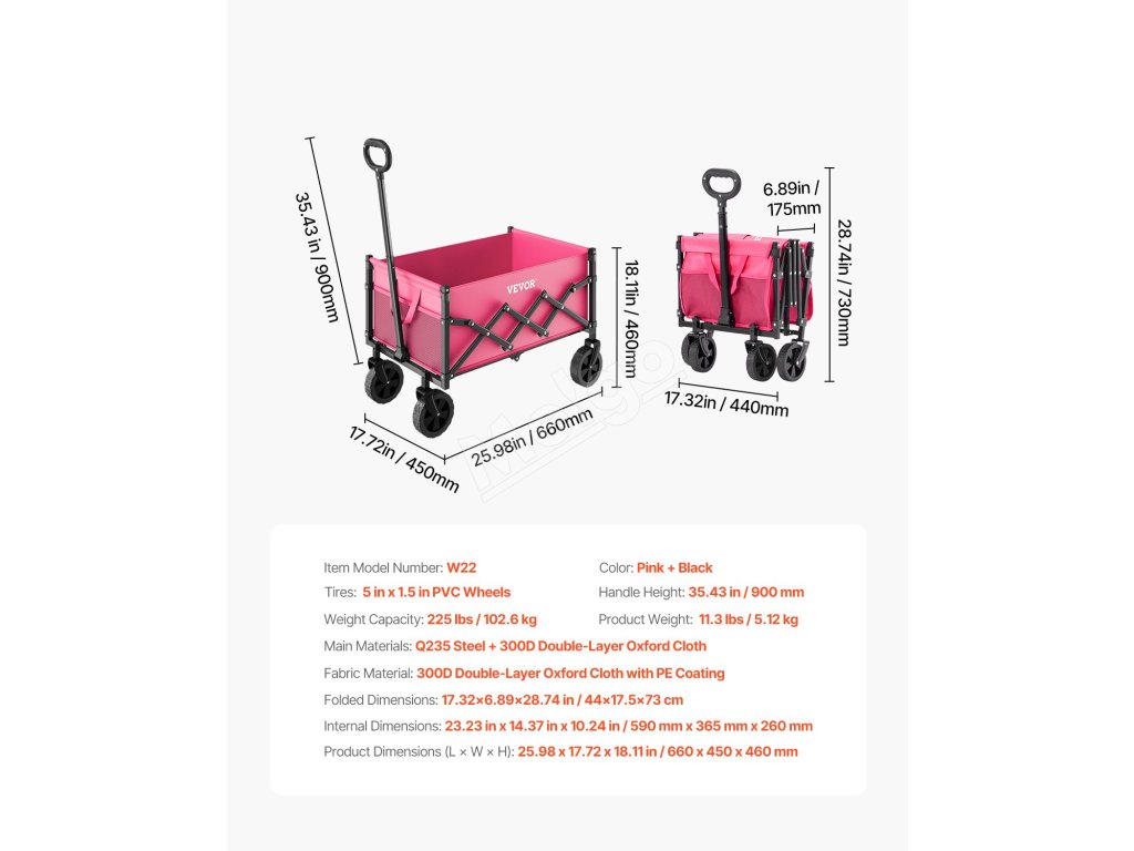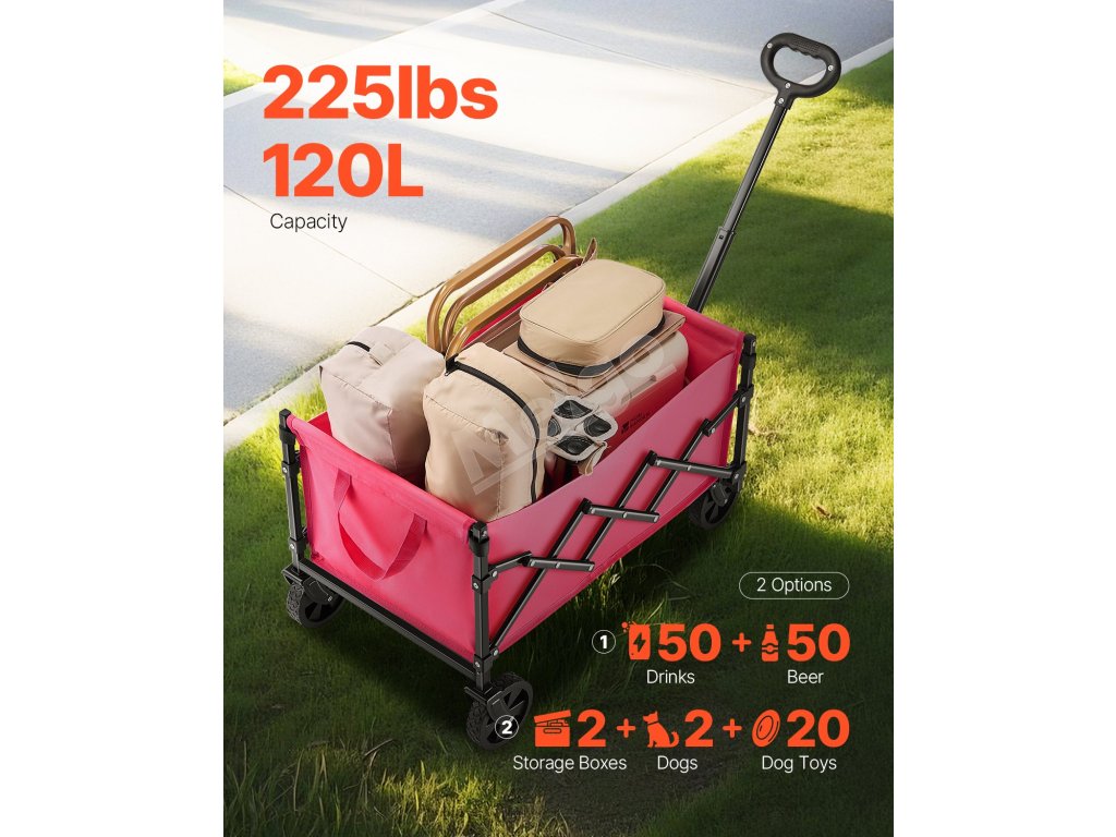 Tento skladací vozík má nosnosť 225 libier a jeho objem 120 l ľahko pojme rôzne predmety, takže je vhodný na nákupy, kempovanie, prepravu do záhrady. Oceľové rúrky odolné proti korózii a tkanina Oxford odolná proti opotrebovaniu zaisťujú trvanlivosť a 360° terénne pneumatiky umožňujú plynulé tlačenie.