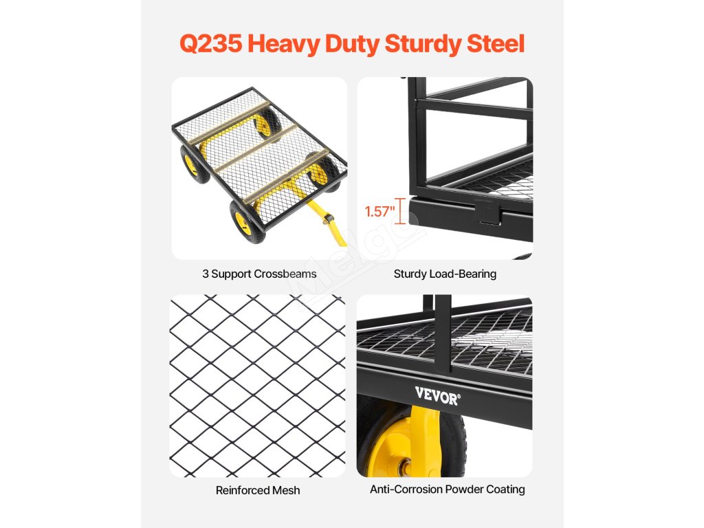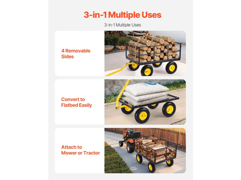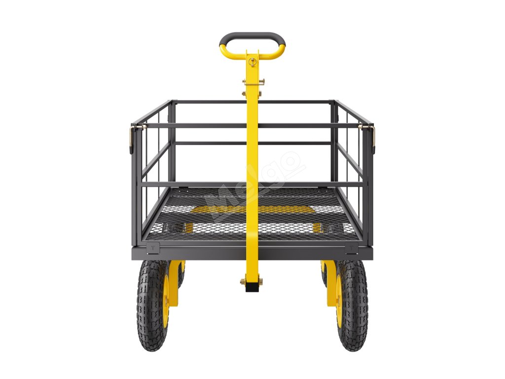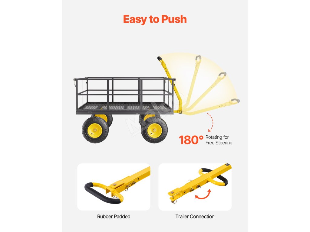 Tento záhradný vozík vyrobený z ocele Q235 ponúka konštrukciu 2 v 1, ktorá sa ľahko prepína medzi ohradeným vozíkom a vozíkom s plochou ložnou plochou. Je vybavený 13-palcovými gumovými pneumatikami, vďaka ktorým sa hladko pohybuje po rôznych terénoch. Univerzálna rukoväť 2 v 1 umožňuje tlačenie a ťahanie prívesu pre záhrady, farmy, sklady.