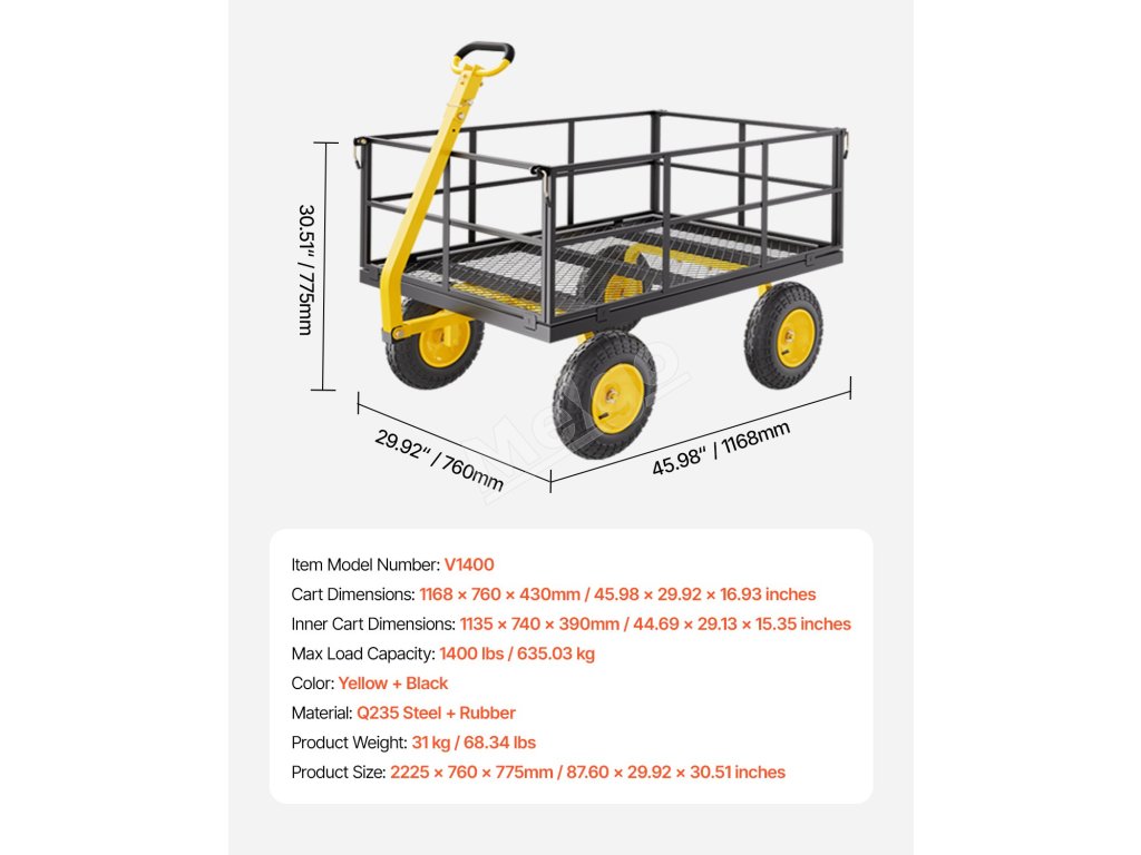 Záhradný oceľový vozík, nosnosť 1400 lbs, 13" terénne kolesá