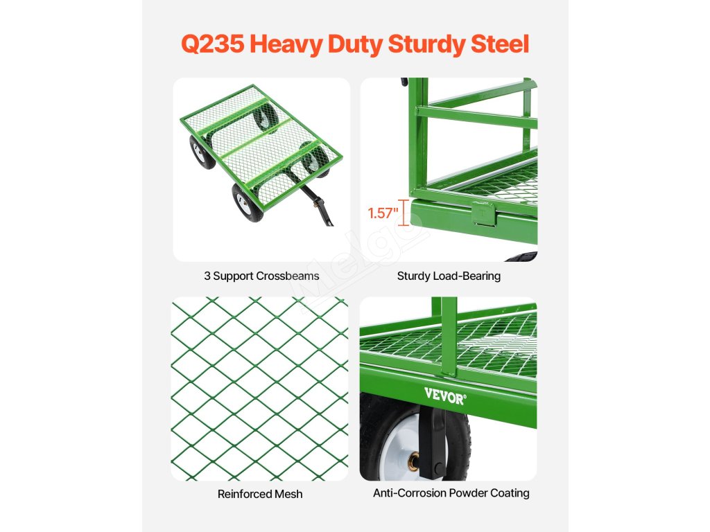 Tento záhradný vozík vyrobený z ocele Q235 ponúka konštrukciu 2 v 1, ktorá sa ľahko prepína medzi ohradeným vozíkom a vozíkom s plochou ložnou plochou. Je vybavený 13-palcovými gumovými pneumatikami, vďaka ktorým sa hladko pohybuje po rôznych terénoch. Univerzálna rukoväť 2 v 1 umožňuje tlačenie a ťahanie prívesu pre záhrady, farmy, sklady.