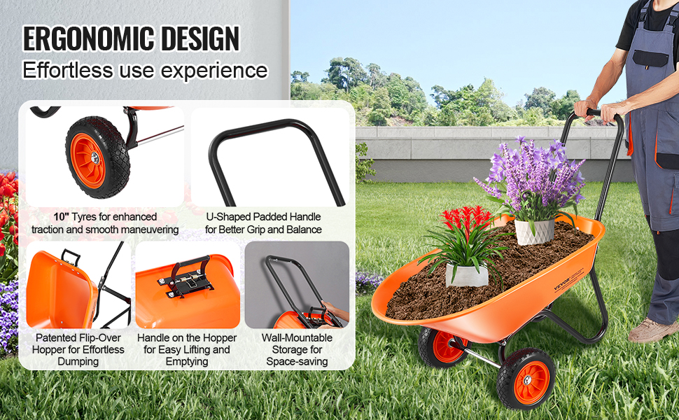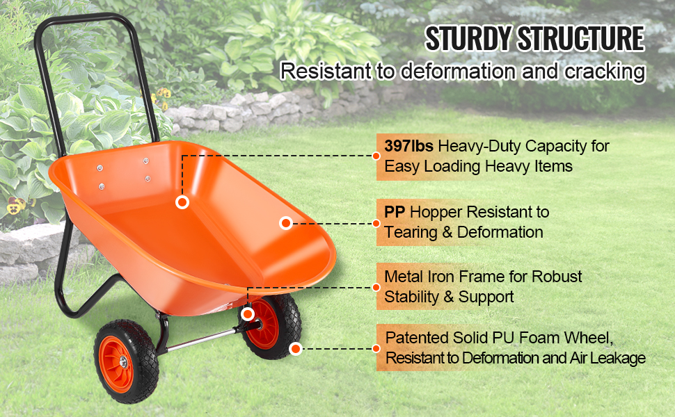 Náš záhradný vozík je vybavený polstrovanou rukoväťou so slučkou na pohodlné tlačenie. Tento vozík na trakare je vybavený dvoma 10-palcovými širokými kolesami s hlbokými behúňmi pre lepšiu trakciu a zabezpečuje hladký a stabilný pohyb. Patentovaná veľkokapacitná vyklápacia vanička umožňuje jednoduché vykladanie.