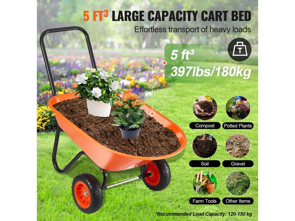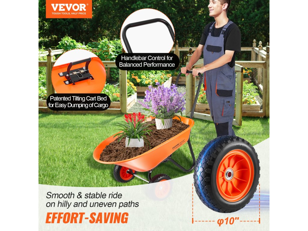 Náš záhradný vozík je vybavený polstrovanou rukoväťou so slučkou na pohodlné tlačenie. Tento vozík na trakare je vybavený dvoma 10-palcovými širokými kolesami s hlbokými behúňmi pre lepšiu trakciu a zabezpečuje hladký a stabilný pohyb. Patentovaná veľkokapacitná vyklápacia vanička umožňuje jednoduché vykladanie.