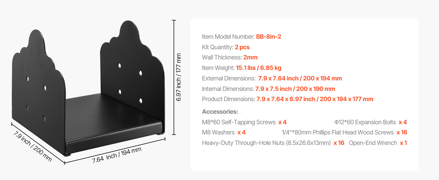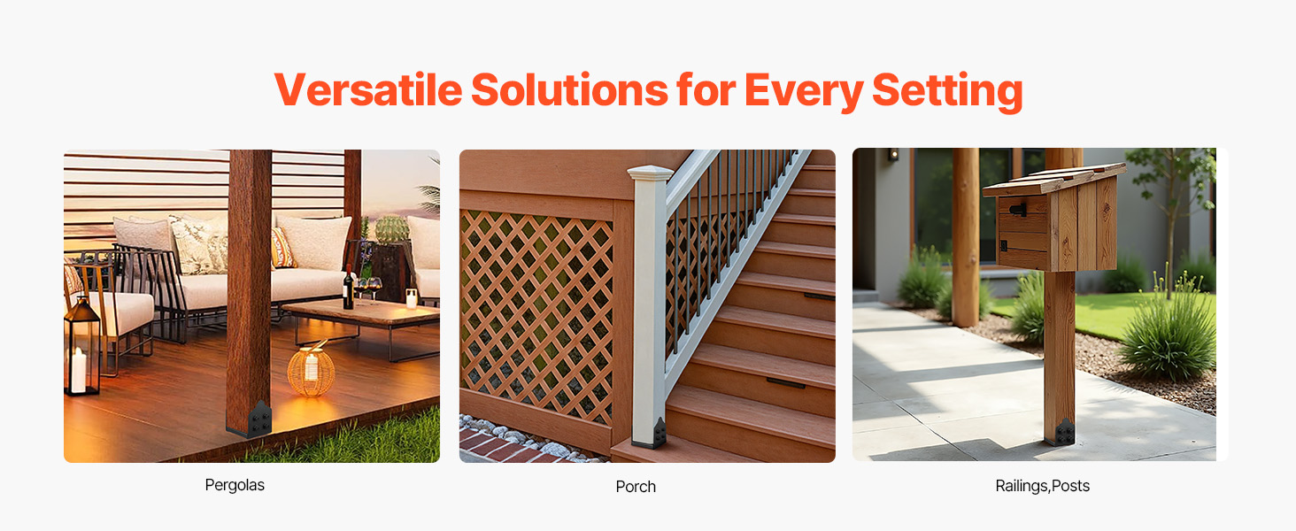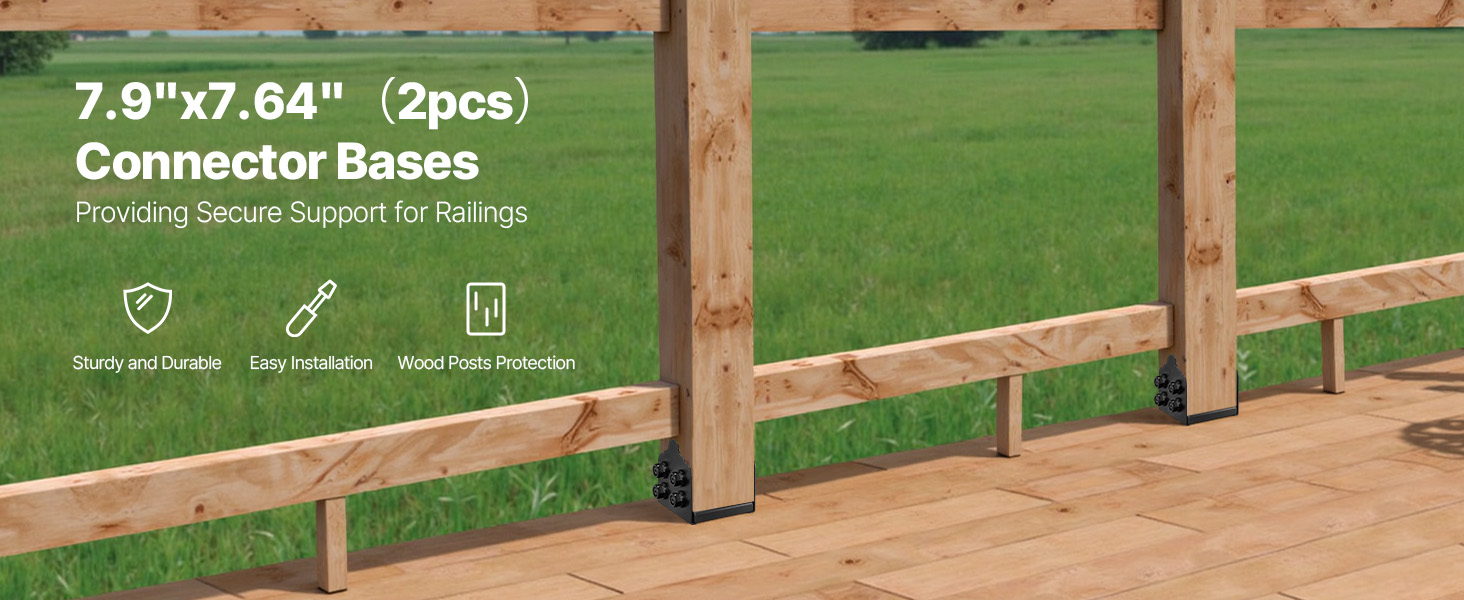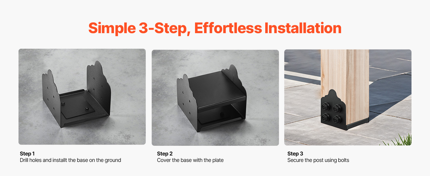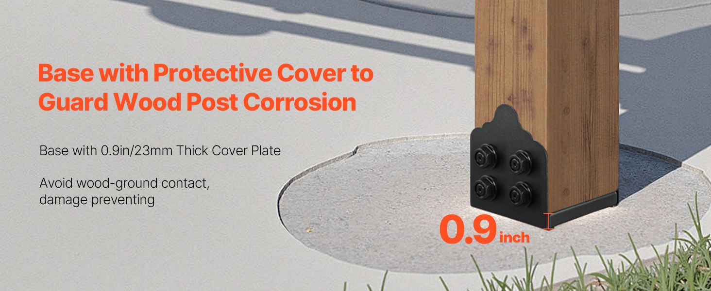 Základňa stĺpika je vyrobená z odolnej uhlíkovej ocele, ktorá je odolná proti korózii a poskytuje stabilnú oporu. Hrubý spodný kryt chráni drevené stĺpiky pred priamym kontaktom so zemou, čím zabraňuje ich rozpadu a deformácii. Vďaka rôznemu príslušenstvu sa ľahko inštaluje na mnohé povrchy a je ideálny na verandové zábradlia, pergoly a stĺpy.