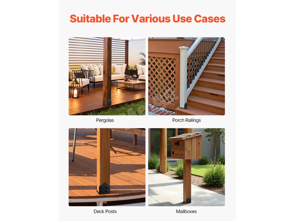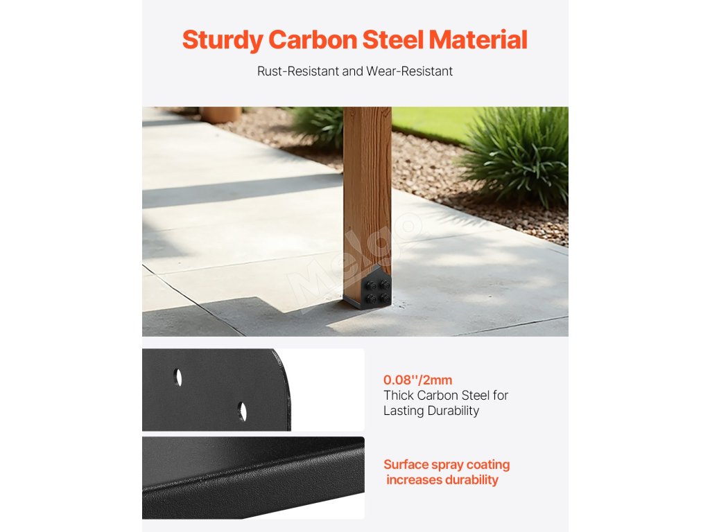 Základňa stĺpika je vyrobená z odolnej uhlíkovej ocele, ktorá je odolná proti korózii a poskytuje stabilnú oporu. Hrubý spodný kryt chráni drevené stĺpiky pred priamym kontaktom so zemou, čím zabraňuje ich rozpadu a deformácii. Vďaka rôznemu príslušenstvu sa ľahko inštaluje na mnohé povrchy a je ideálny na verandové zábradlia, pergoly a stĺpy.