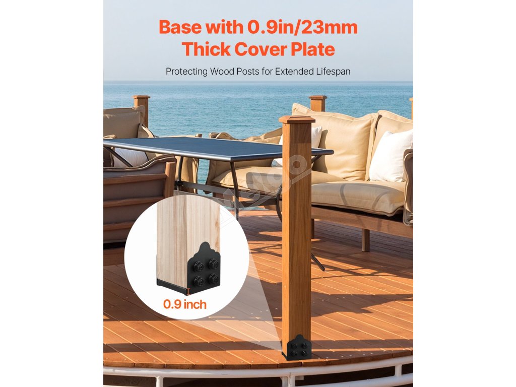 Táto základňa pre stĺpik paluby je ideálna na pevné inštalácie v pergolách, zábradliach verandy a podobne, pretože poskytuje spoľahlivú ochranu.