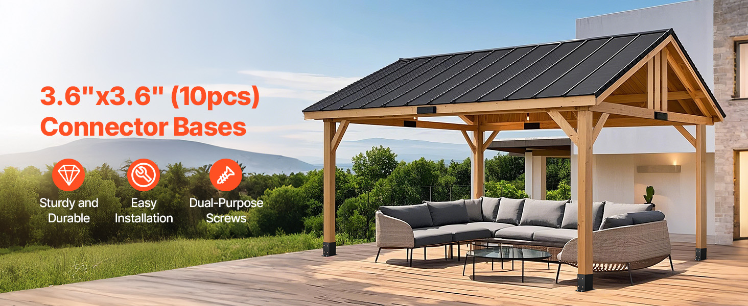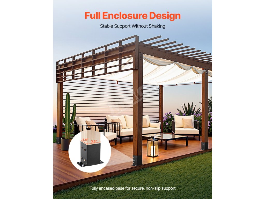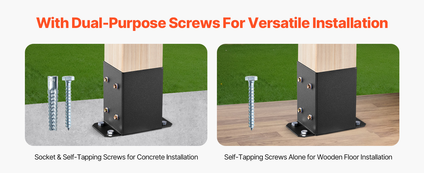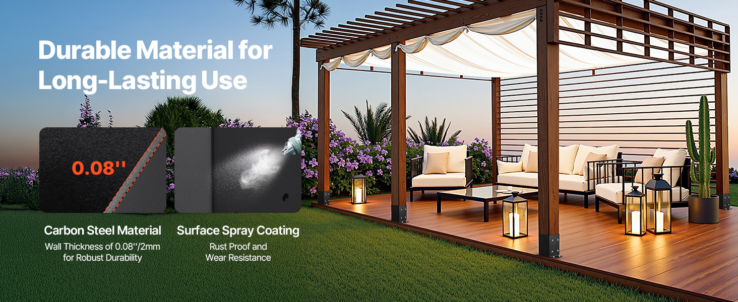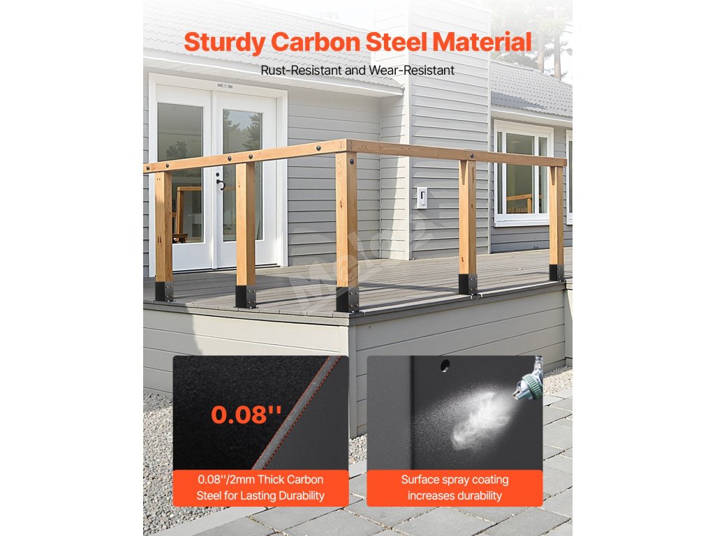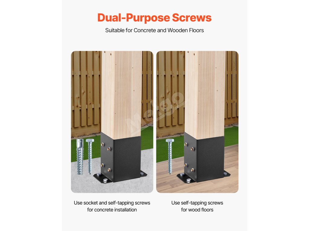 Základňa stĺpika je vyrobená z robustnej uhlíkovej ocele, ktorá ponúka trvanlivosť a odolnosť voči korózii a opotrebovaniu. Poskytuje stabilnú oporu a dodáva sa s dvojúčelovými skrutkami, ktoré uľahčujú inštaláciu na betónových aj drevených podlahách. Je ideálny na pevné inštalácie v pergolách, zábradliach verandy a podobne.