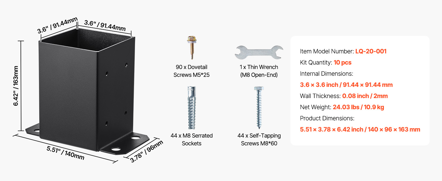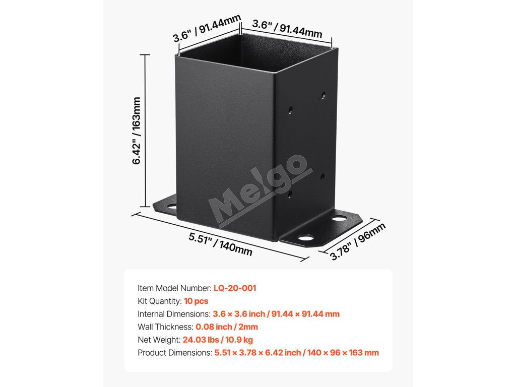Základňa stĺpu 4×4 10 ks, vnútorná 3.6×3.6 inch / 91.44×91.44 mm, oceľ