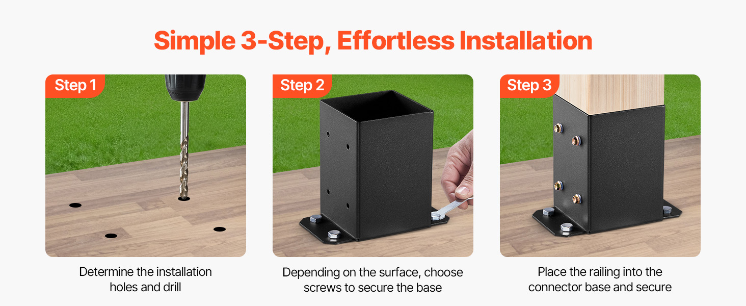 Pomocou elektrickej vŕtačky na vytvorenie otvorov je naša základňa pre stĺpik paluby vybavená otvormi na skrutky na jednoduchú inštaláciu pomocou skrutiek, vďaka čomu je montáž jednoduchá.