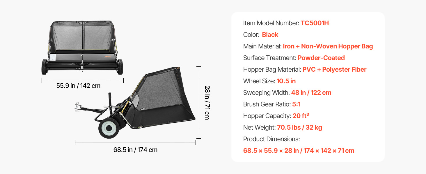 Záhradný zametací stroj s rozšíreným kontaktom kovu s kefou posilňuje výkon zametania a zabezpečuje dôkladné čistenie suchého lístia a zvyškov z dvora. Vďaka šírke zametania 48 palcov / 122 cm môžete na jeden prechod pokryť väčšie plochy a rýchlo si poradiť aj s hustým opadaným lístím.