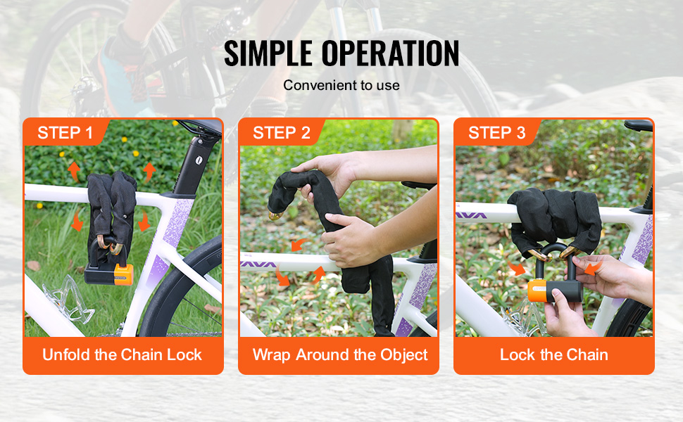 Tento reťazový zámok na bicykel možno počas jazdy ľahko omotať okolo rámu a stĺpika sedadla bicykla, čím sa zabezpečí jeho prenosnosť a zníži sa záťaž na ceste, čím sa dosiahne dokonalá rovnováha medzi bezpečnosťou a pohodlím.