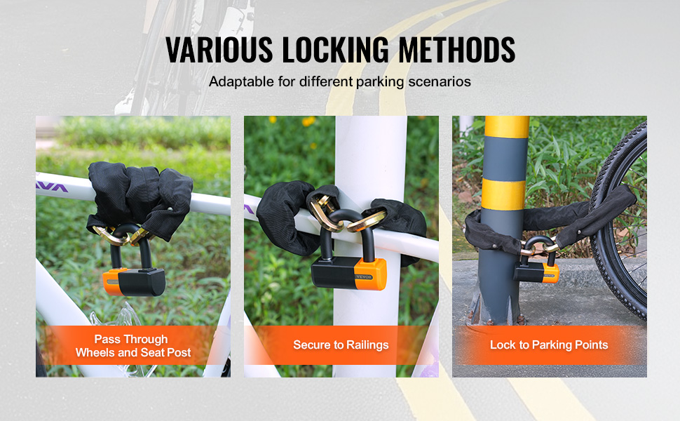 Tento reťazový zámok na bicykel ponúka viacero spôsobov uzamknutia, ktoré sa prispôsobia rôznym scenárom parkovania. Či už ide o uzamknutie cez koleso a stĺpik sedadla, alebo o zabezpečenie k zábradliu či určenému parkovaciemu miestu, spĺňa všetky vaše potreby.