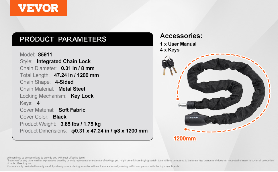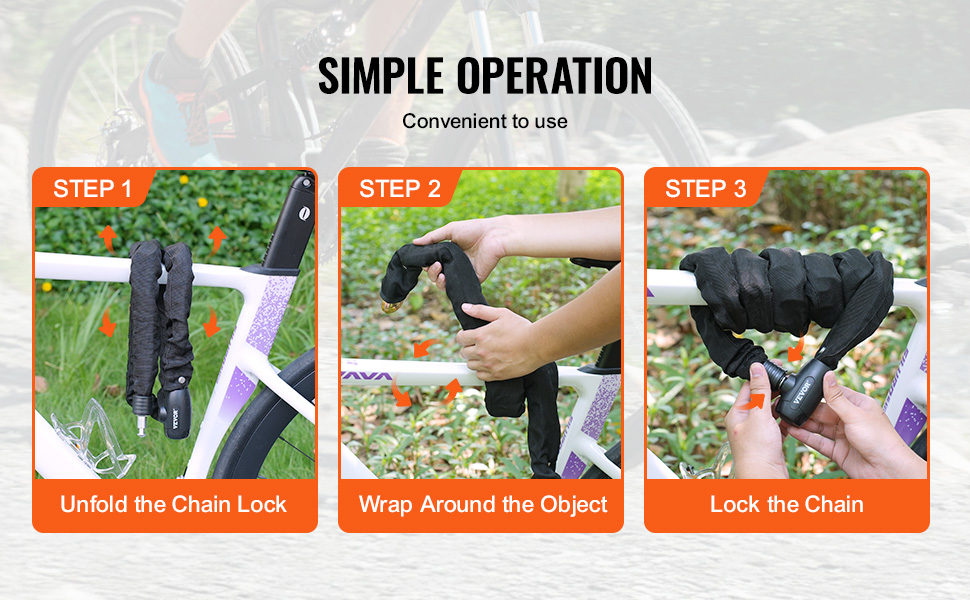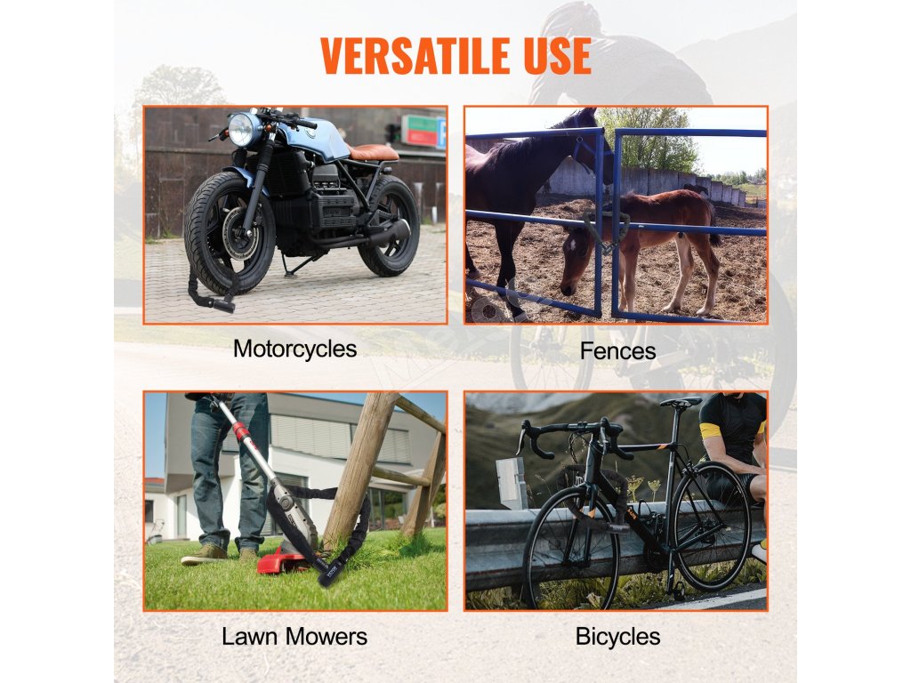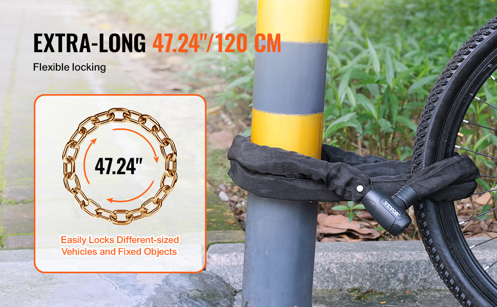 Konštrukcia s dĺžkou reťaze 47,24 palca / 120 cm umožňuje bez námahy zabezpečiť rôzne veľkosti vozidiel a pevných predmetov, nech ste kdekoľvek.