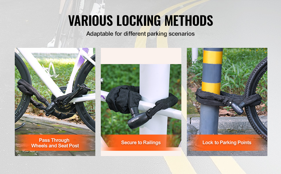 Tento reťazový zámok na bicykel ponúka viacero spôsobov uzamknutia, ktoré sa prispôsobia rôznym scenárom parkovania. Či už ide o uzamykanie cez koleso a stĺpik sedadla, alebo o zabezpečenie k zábradliu či určenému parkovaciemu miestu, spĺňa všetky vaše potreby.