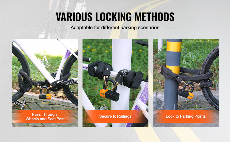 Táto reťaz na zamykanie bicyklov ponúka viacero spôsobov uzamykania, ktoré sa prispôsobia rôznym scenárom parkovania. Či už ide o uzamknutie cez koleso a stĺpik sedadla, alebo o upevnenie k zábradliu či určenému parkovaciemu miestu, spĺňa všetky vaše potreby.