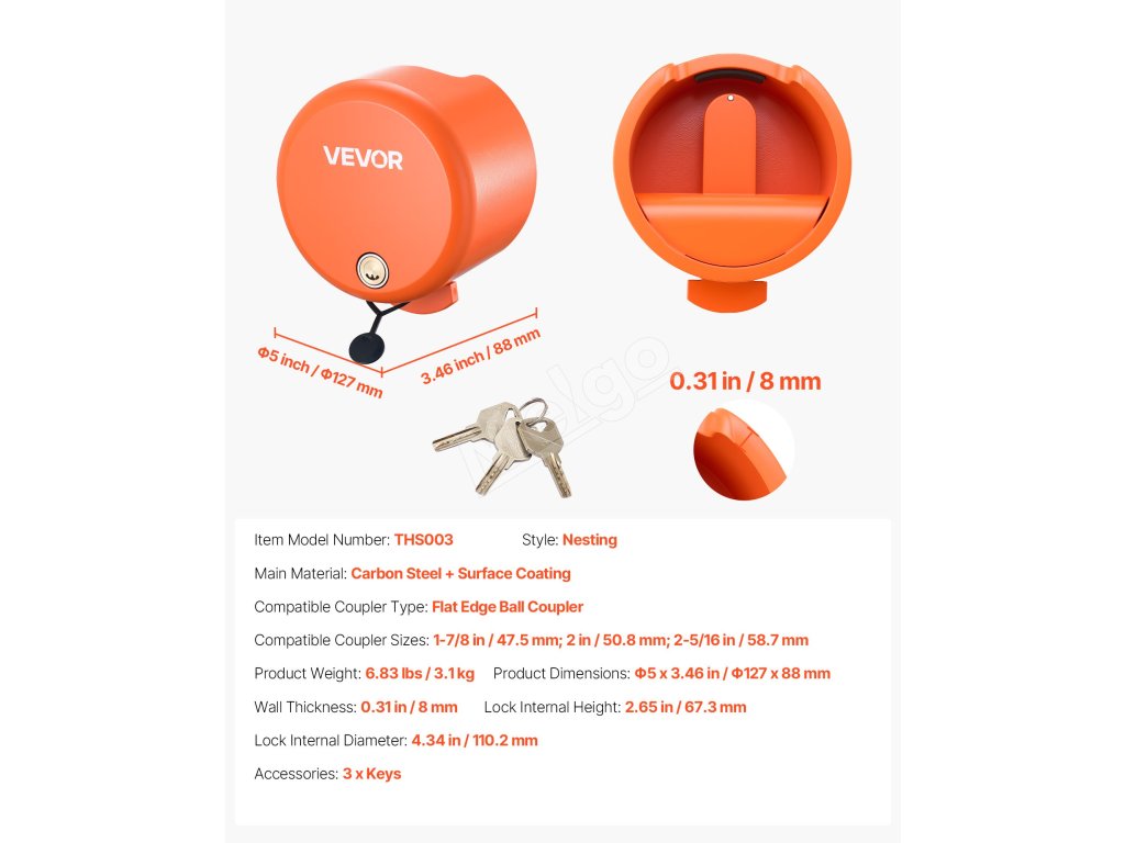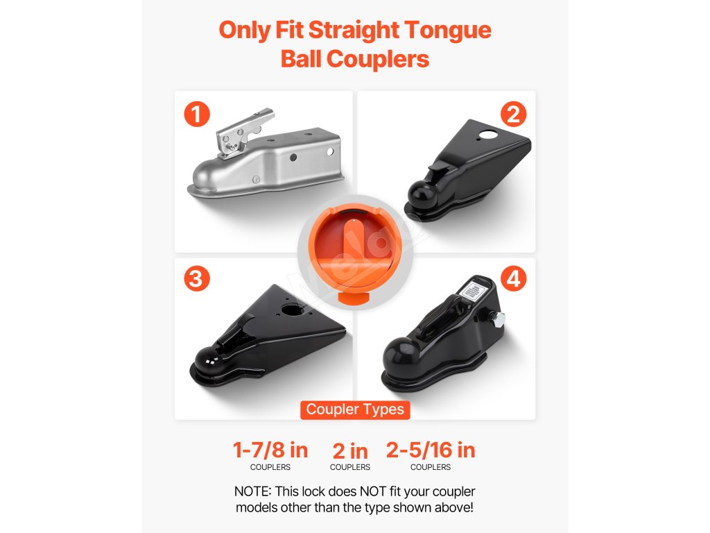 Tento zámok prívesu je vhodný pre 1-7/8, 2 a 2-5/16 palcové guľové spojovacie zariadenia s rovným jazykom. Poznámka: Pred nákupom si pozrite obrázky, aby ste sa uistili, že zodpovedá vášmu spojovaciemu zariadeniu, aby presne pasoval!