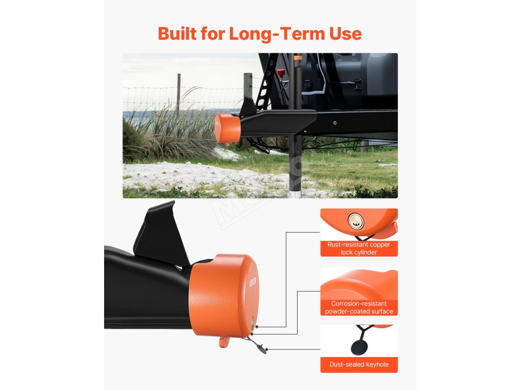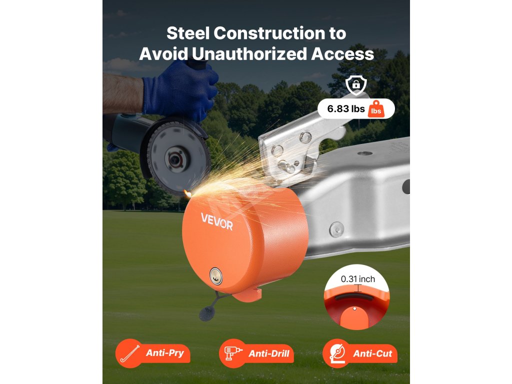 Náš 6,83 kg ťažký zámok spojky je vyrobený z vysokopevnostnej uhlíkovej ocele, vďaka čomu je odolný a bezpečný pre váš príves alebo obytný automobil. Zabezpečte svoje vozidlo pred krádežou, keď je zaparkované vonku!