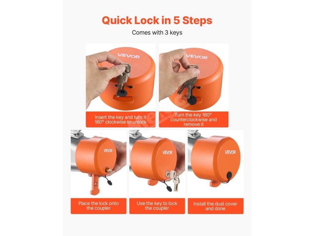 Tento zámok závesu sa jednoducho používa, pričom súčasťou balenia sú 4 kľúče, a je vhodný pre obytné vozidlá, prívesy, lode a ďalšie vozidlá. Jednoducho ho uzamknite na spojovacom zariadení a zabezpečte svoje vozidlo pred rizikom krádeže, čím získate pokoj na duši.