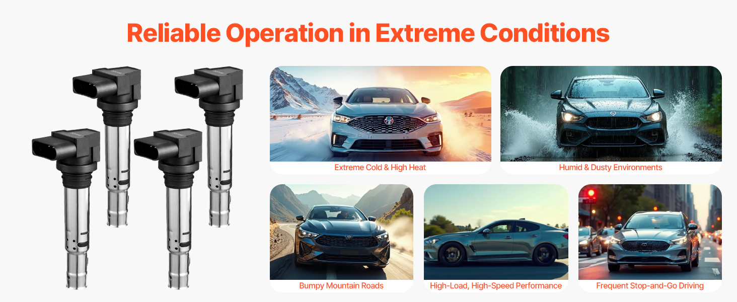 Či už v extrémnych mrazoch alebo horúčavách, vlhkých a prašných podmienkach, na drsných horských cestách, pri vysokom zaťažení alebo vysokorýchlostnej prevádzke, alebo pri častom zastavovaní a rozbiehaní v meste, naša zapaľovacia cievka do auta to všetko hravo zvládne a zabezpečí stabilný a spoľahlivý výkon pre bezproblémovú jazdu.