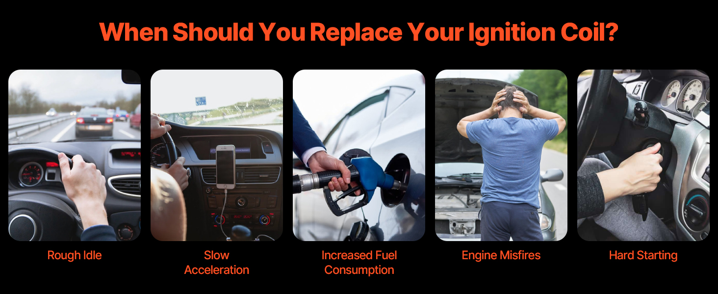 Ak sa vo vašom vozidle vyskytnú problémy, ako je nestabilný voľnobeh, pomalé zrýchľovanie, zvýšená spotreba paliva, abnormality motora alebo ťažkosti so štartovaním, včasná výmena zapaľovacej cievky môže obnoviť výkon motora a zabrániť ďalším škodám.